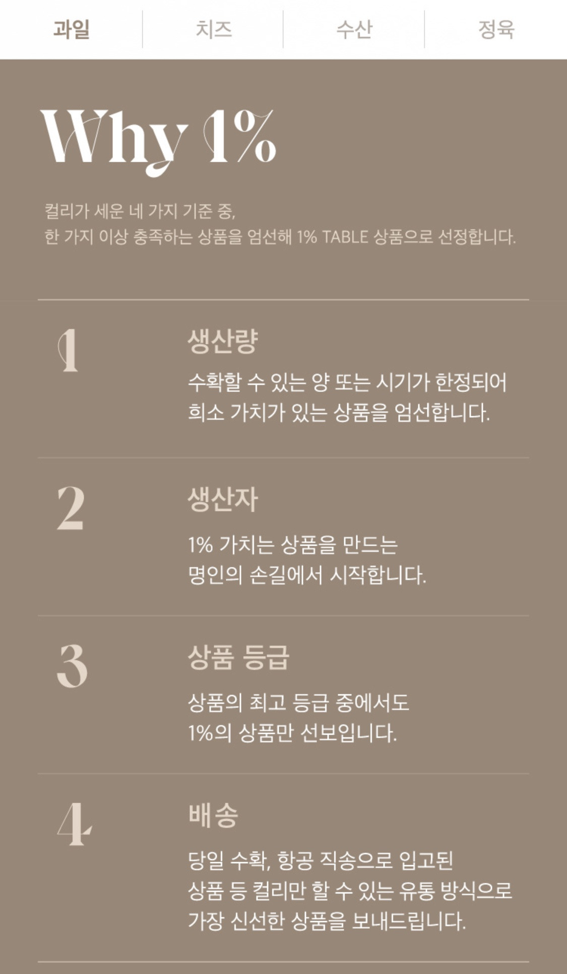 마켓컬리는 '신선함을 문 앞까지'라는 캐치프레이즈를 내세우며 오늘 밤 주문하면 내일 새벽에 도착하는 샛별 배송을 시장에 선보였다. 밤 11시 전에만 주문하면 아침 7시 전에 내가 주문한 제품을 받아볼 수 있는 것이다. 내가 원하는, 신선한 제품을, 그것도 아주 빠르게 배송받을 수 있다는데 그걸 싫어할 사람이 누가 있을까? 물론 아직 샛별배송이 지원되지 않는 수도권 지역 외 소비자들은 이 혜택을 누릴 수 없지만, (수도권에 제공되는 샛별배송이 마켓컬리 전체 주문량의 80~90% 를 차지한다고 한다. 대다수의 고객이 수도권에 집중되어 있음은 사실이다.) 일반 택배 배송이라고 해서 배송이 느리거나 품질이 떨어지는 것은 아니다. 기본적으로 배송되어 오는 제품의 품질이 타 이커머스 대비 만족스럽기 때문에 이러한 차이에도 불구하고 지방에 사는 사용자들이 계속해서 마켓컬리를 이용하는 것일 지도 모른다.