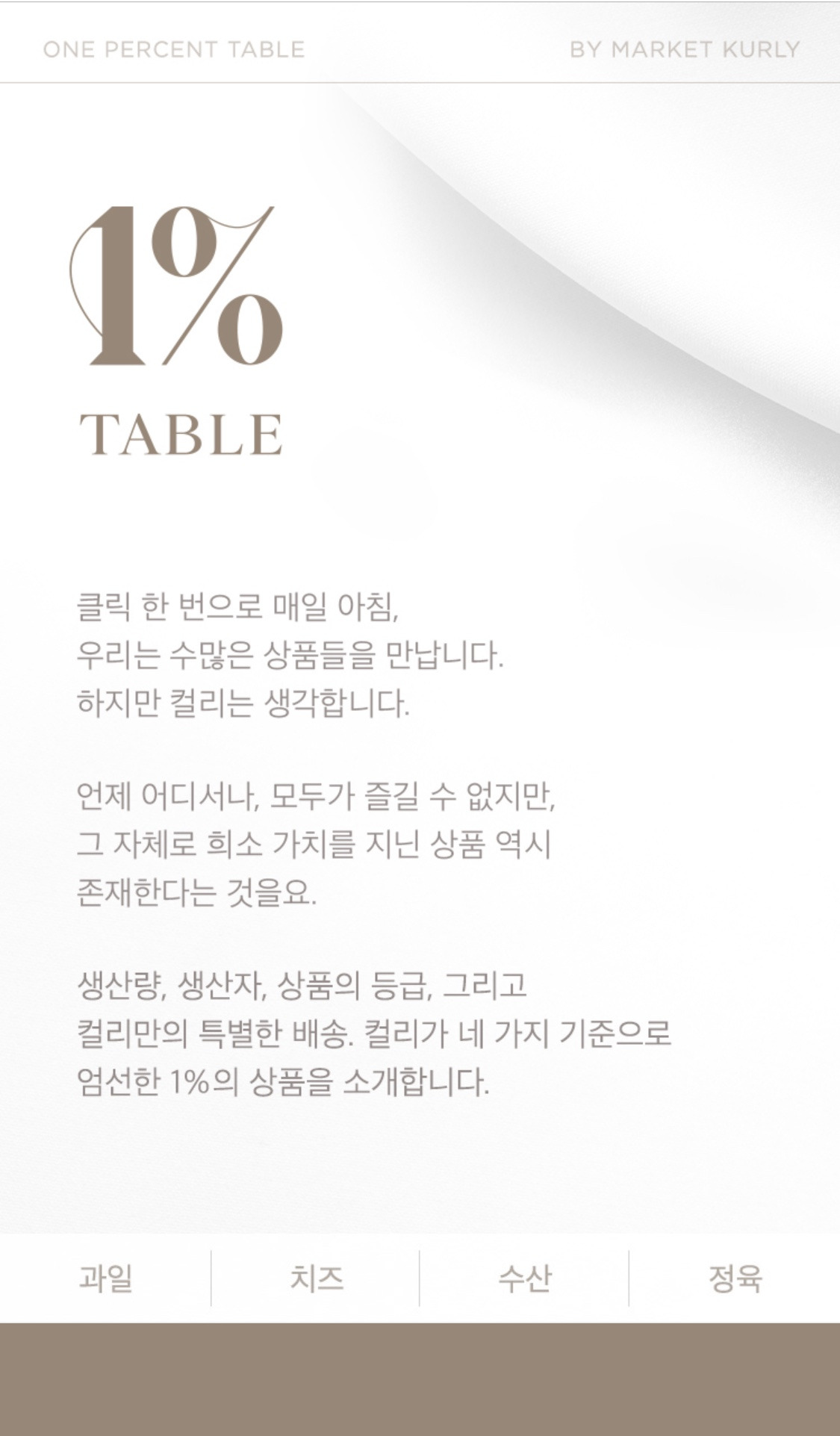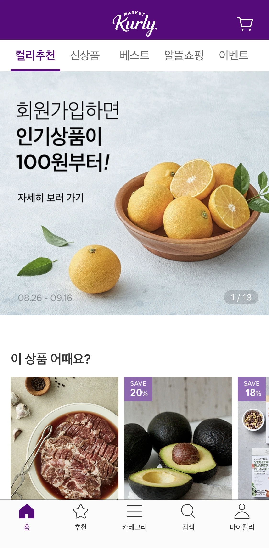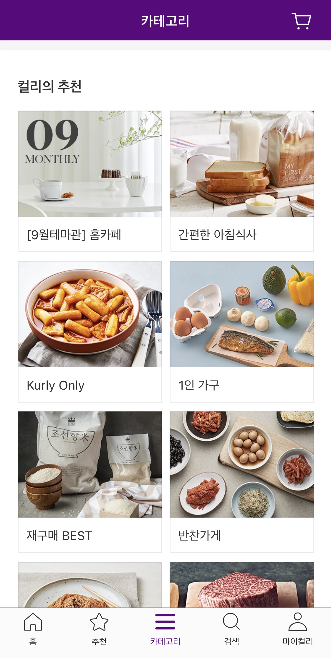 마켓컬리의 앱을 실행해 보면 알겠지만, 앱 실행 화면부터 랜딩 페이지까지 모두 팬톤 감성의 보라색으로 디자인되어있다. 같은 계열의 컬러를 채택하여 화면에 일치감을 주고(재미있게도 최상위 회원 등급의 명칭도 더 퍼플이다. 컬리가 얼마나 자체적인 브랜드 컬러에 집착하고 있는지 잘 보여주는 예라고 생각), 상하단 메뉴의 복잡성을 줄여 사용자의 빠른 적응을 돕는 인터페이스다. 랜딩페이지의 디폴트 메뉴는 신상품, 베스트 상품도 아닌 컬리 추천이다. 상단에는 상시적으로 컬리의 '월간 테마관'이라는 큐레이션 리스트를 노출시켜 해당 기획전으로 유저의 진입을 유도하고 있으며 좌우로 SWIPE시 현재 컬리가 진행 중인 기타 기획전으로 진입할 수 있다.