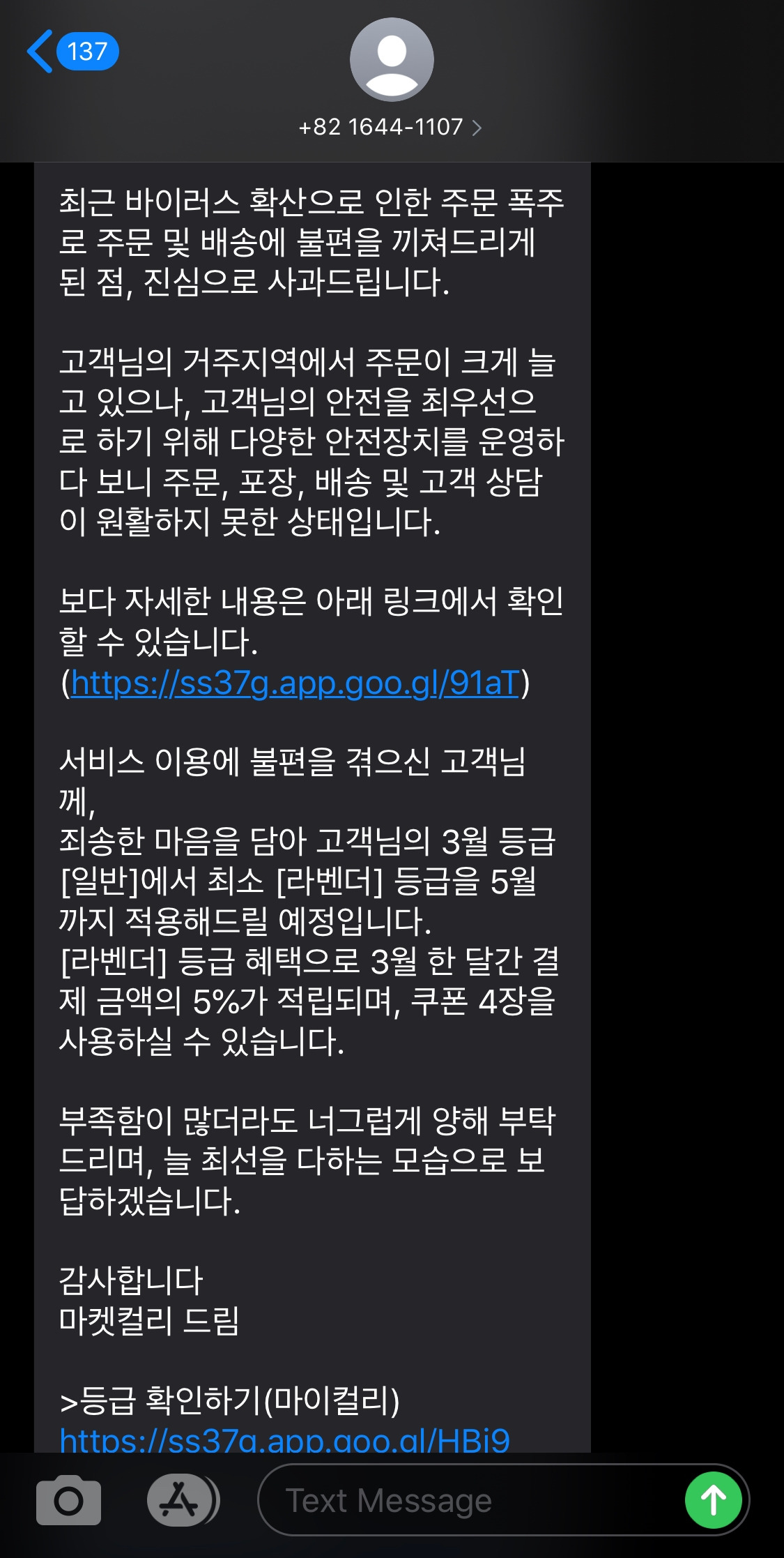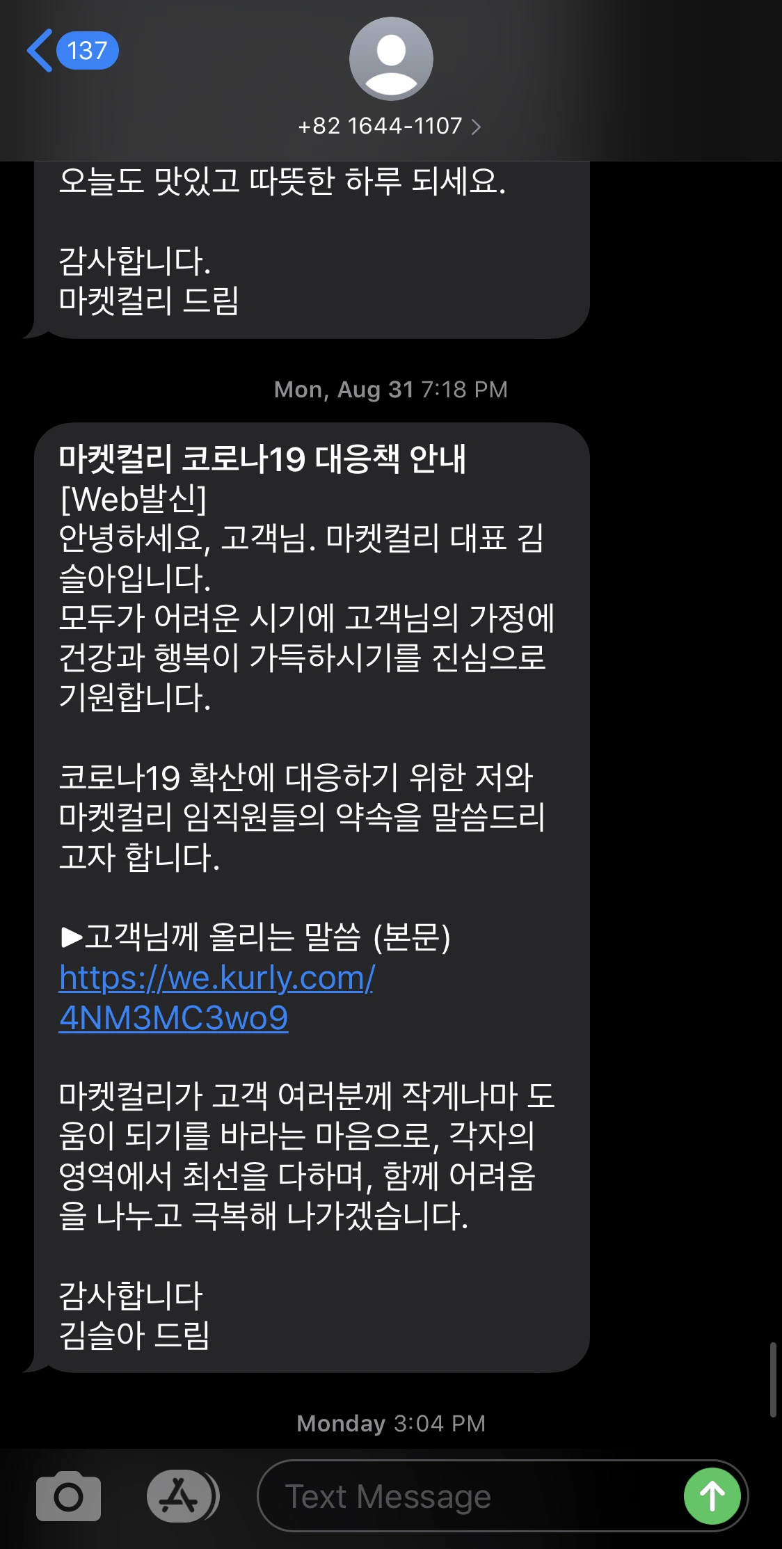 며칠 전, 익숙한 번호로 문자 한 통을 받았다. 마켓컬리 고객센터로부터 온 문자였다. 최근 코로나 19로 인해 많은 이커머스 회사들이 배송에 어려움을 겪고 있다. 사회적 거리두기로 불필요한 외출은 자제하게 되면서 대다수의 사람들이 집에서 보내는 시간이 늘어난 탓일까? 물건이 입고되는 11시 경에 들어가서 장바구니를 채워도 결제 전에 품절이 되는 경우가 허다했다. (요즘에는 부라타 치즈가 유행인가 보다. 예전보다 품절 빈도가 잦다.) 코로나 19의 영향으로 마켓컬리의 올 연간 매출은 작년 대비 배 이상 성장할 것으로 보인다고 하니, 이런 시국일수록 많은 사람들이 마켓컬리와 같은 장보기 서비스에 의지하고 있다는 점을 알 수 있다.