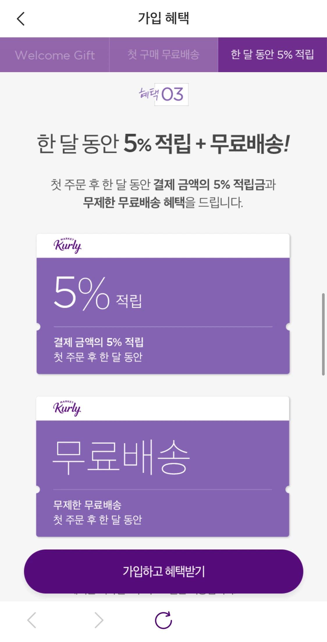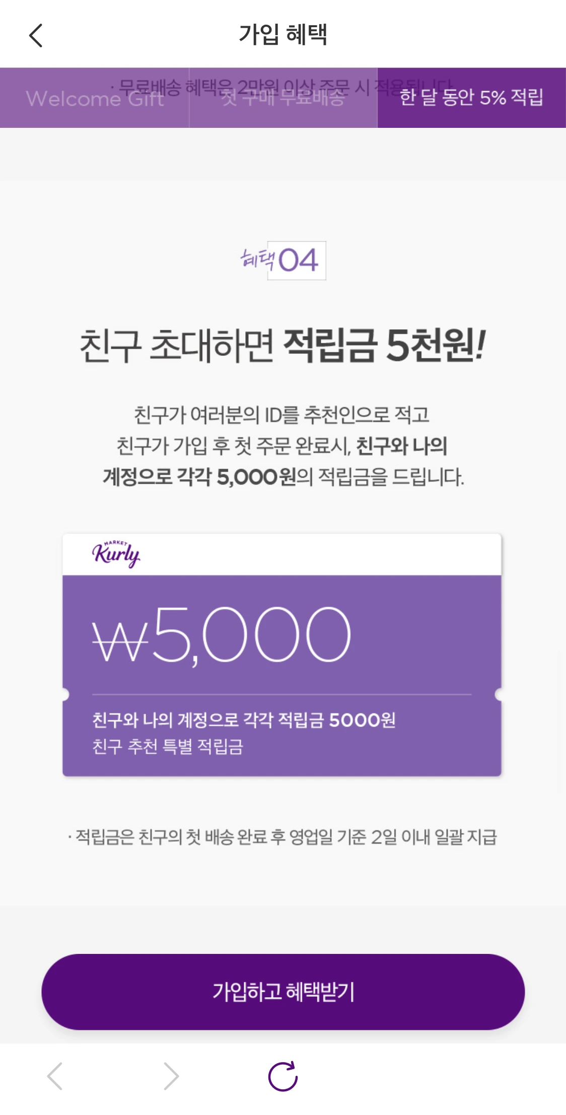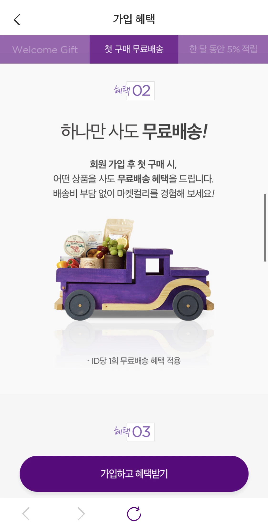 샛별배송만이 전부일까? 마켓컬리는 잠재 고객들에게 파격적인 가입 혜택을 제공하고 있다. 회원가입을 하면 인기상품을 단돈 100원에 구입할 수 있고, 가입 후 첫 구매 고객을 대상으로 무료배송과 한 달 내내 5% 적립(전월 실적 50만 원 이상의 라벤더 등급에 해당하는 적립률이다.) 혜택까지 받을 수 있다. 뿐만 아니라 친구 추천 적립금 이벤트도 진행하면서 공격적으로 잠재 고객을 포섭한다. 어차피 온라인으로 장을 볼 소비자들은 '이런 상품이 100원이라는데 딱히 손해볼 게 없다'는 생각으로, 마켓컬리를 '가볍게' 사용해볼 수도 있는 것이다.