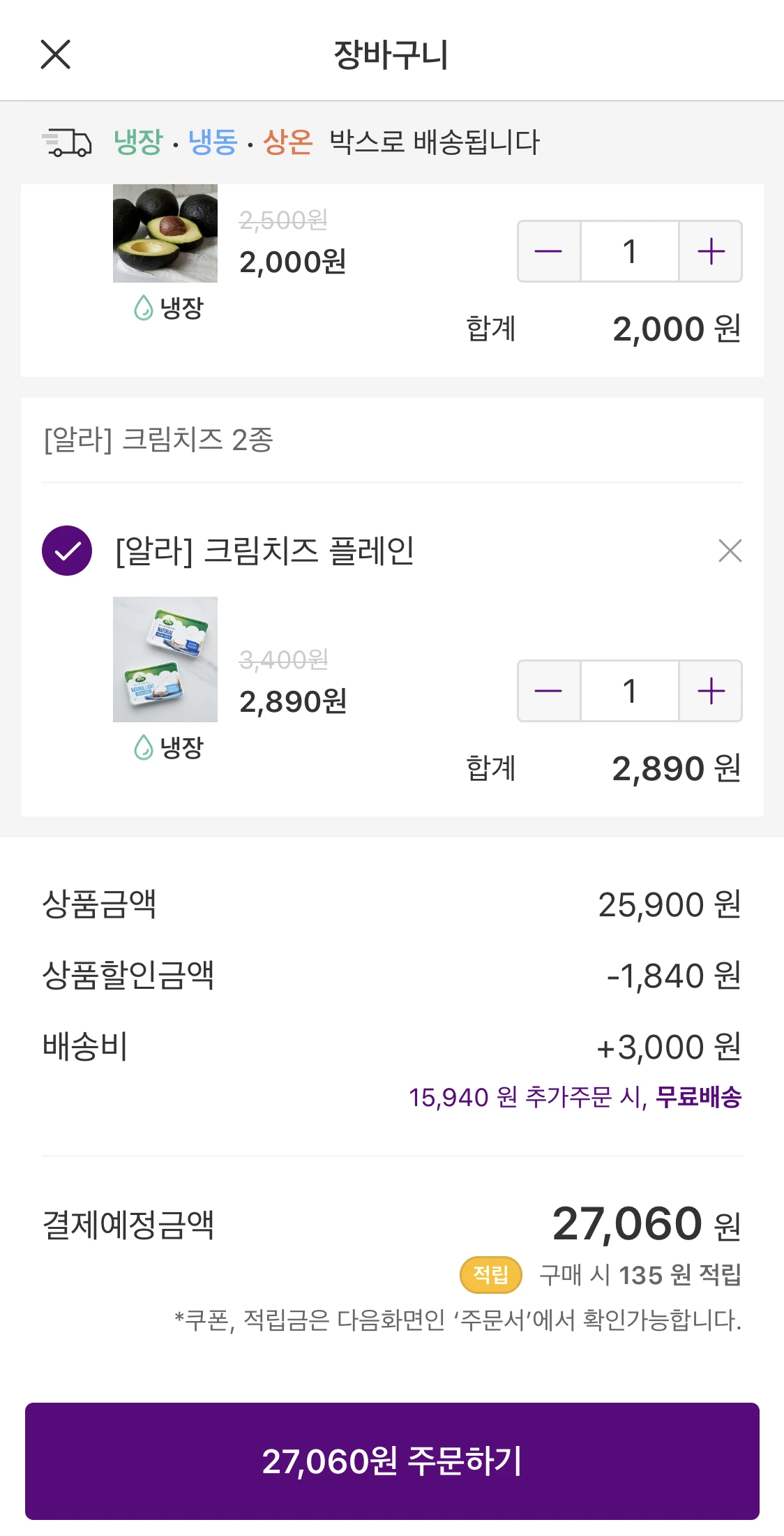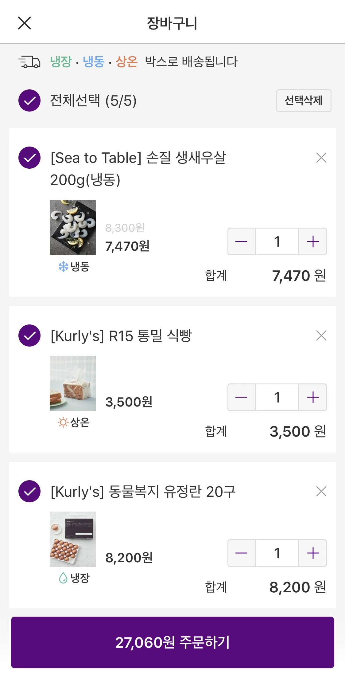 마켓컬리가 신선한 배송을 지향하는 회사임이 가장 단편적으로 잘 드러나는 부분이 바로 장바구니 화면이 아닐까? 사용자가 제품을 장바구니에 추가하면 컬리는 1. 냉장 / 2. 냉동 / 3. 상온으로 배송 align을 갖춰 소비자의 대문 앞까지 배송한다. 내가 기억하기론, 초기의 서비스에서는 위의 화면과 같이 박스가 구분되어 배송된다는 안내문구가 보여지지 않았다. 어느 시점부터 구매자에게 분리 배송됨을 인지시키는 인터페이스로 개선되었는데, 이 부분에 대해서는 소비자의 반응이 갈릴 여지가 충분히 존재하는 듯하다. 어떤 소비자는 '제품의 신선도가 보장되겠구나'하는 생각으로 안심을 하는 반면, 환경에 관심이 많은 소비자는 배송 단계에서 발생되는 쓰레기에 더 초점을 맞출 수도 있다.