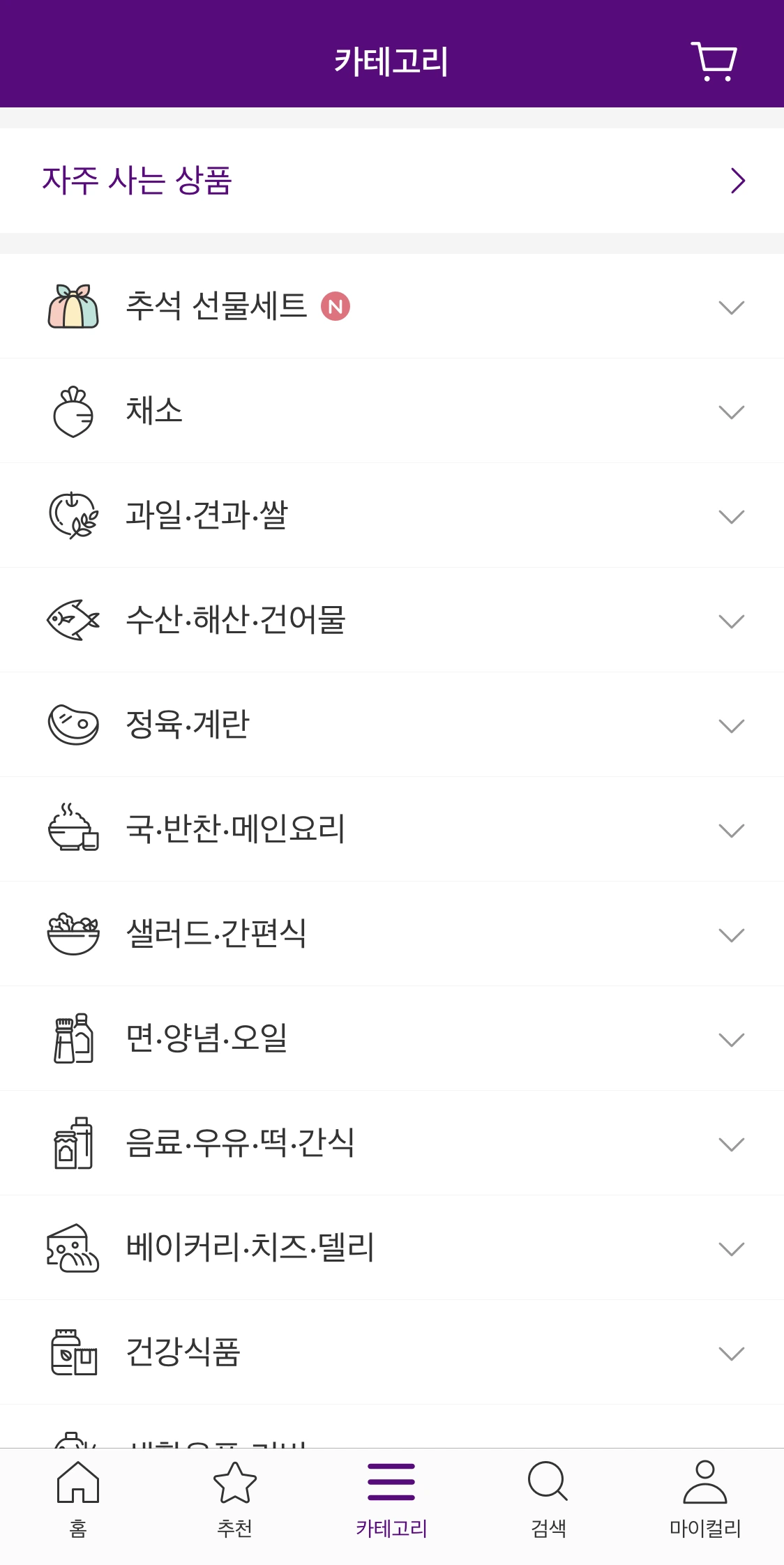 카테고리도 단순하게 구성되어 있다. 자주 사는 상품, 그리고 상세 카테고리. 카테고리를 터치하면 하단으로 펼쳐지는 하위 카테고리를 확인할 수 있는 구조. 종류 별로 잘 분리되어 있어 식별하기 편하다. 여기서 흥미로웠던 점은 마켓컬리의 경우 다른 이커머스들이 제공하는 <즐겨찾기>와 다르게 <자주 사는 상품> 옵션을 제공하고 있다는 점이었다.