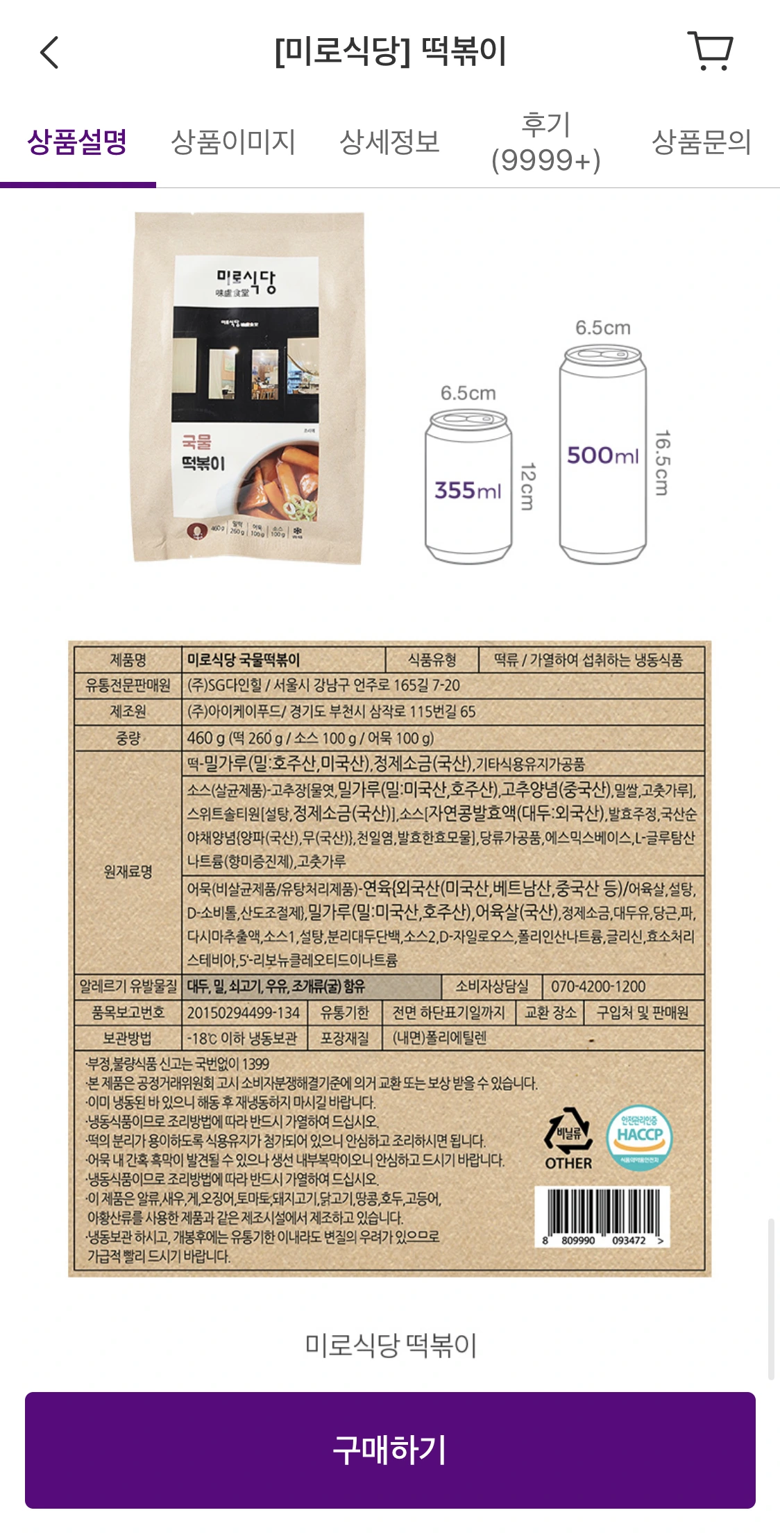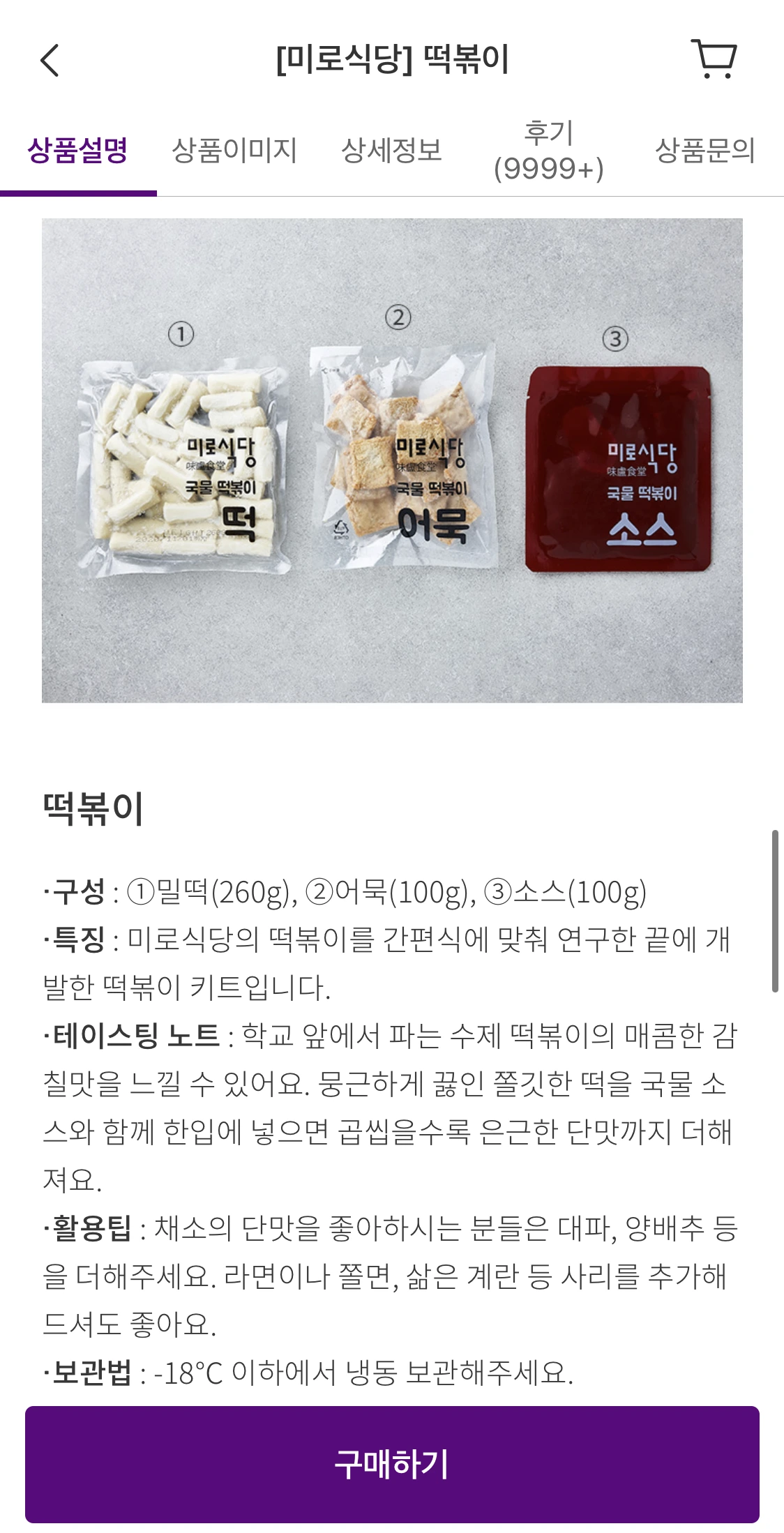 위의 사진은 마켓컬리 대표 상품 중 하나인 미로식당의 상품 페이지 화면이다. 상품 이미지부터 매우 정직한 느낌이 든다. 떡과 어묵, 소스가 어떤 패키지로 포장이 되어있는지? 중량은 얼마인지? 원재료는 무엇인지? 타 이커머스처럼 어떻게 찍었는지도 모를 흐릿한 이미지 대신 선명하고 반듯한 이미지를 제공하며 고객의 이해를 돕는다. 또한 상품 후기와 문의란을 같은 탭에 위치시켜 소비자들이 상품 구매 전 리뷰를 쉽게 읽어볼 수 있도록 했다. 페이지 내용이 많을수록 상하로 스크롤이 길어진다는 단점이 있지만 캡쳐 화면에서 확인할 수 있듯 앱 스크롤 바를 화면 우측에 제공하고 있어 손쉽게 이동할 수 있다.