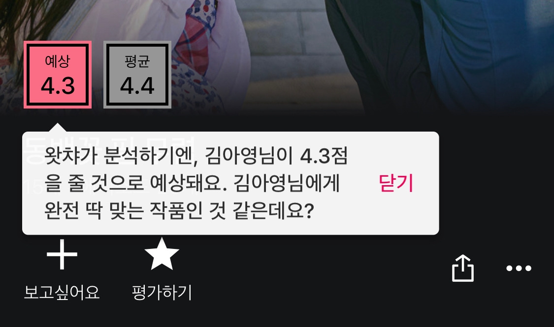 또한 개인화 큐레이션을 숨겨놓지 말고 좀 자랑했으면 좋겠다. 왓챠 앱의 경우 항목을 터치해야 발생되는, 숨어있는 토스트 팝업들이 많다. 간단한 예로, 내 예상 별점을 터치해야 'OO님에게 완전 딱 맞는 작품일 것 같은데요?' 라는 안내 문구가 발생한다던지. 이는 하나의 예시일 뿐이다.