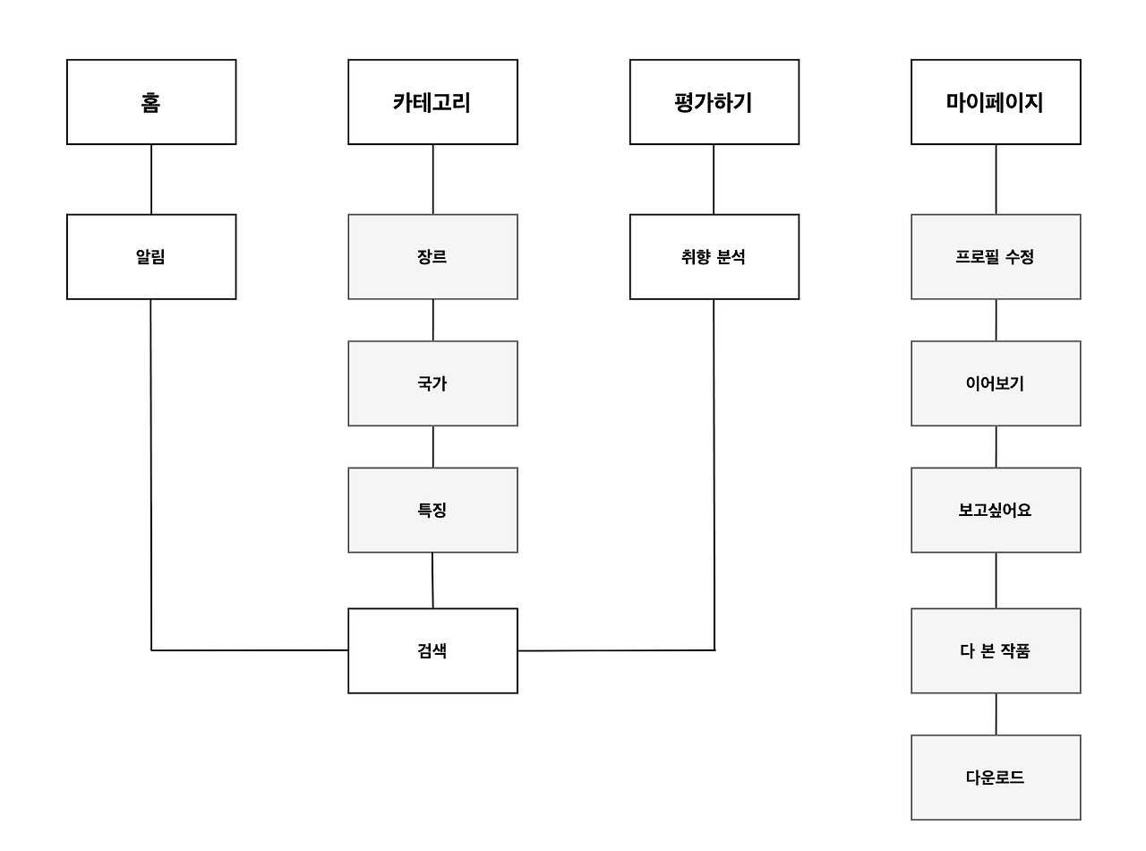 왓챠 로그인을 끝내면 가장 먼저 보이는 홈 화면이다. 왓챠는 홈 화면 최상단에 알림과 검색 기능만 빼놓고 컨텐츠 위주로 배치하는 방식을 택했다. 만약 기존에 시청하던 컨텐츠가 있다면 유저의 이어 보기 탭이 화면 상단에 위치하고, 후로는 [왓챠 최고 인기작] - [최고 인기 시리즈] - [역대 박스오피스 Top 100]- [새로 올라온 작품] 그리고 [취향 추천 작] 순이다. 재미있는 점은 왓챠피디아에서 유저가 직접 만든 영화 컬렉션을 홈 피드에 추천해준다는 점이었다. 이 역시도 사용자의 취향이 최우선적으로 반영된 결과이겠지만, 다른 유저가 셀렉한 컬렉션을 그대로 추천 리스트에 올린다는 점이 다소 새롭다.