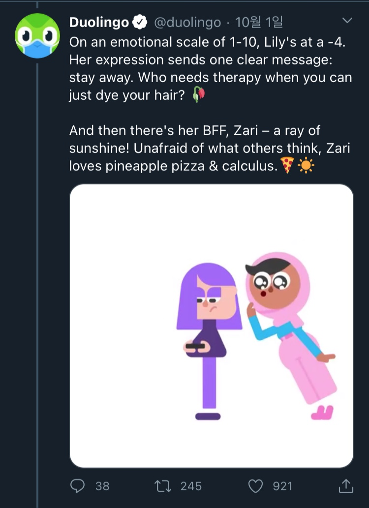 소정 : 이 부분은 평가하기가 어려웠는데, 시각적으로 '보기 좋다'는 너무 주관적인 문제이기 때문이다. 하지만 듀오링고가 UI 통일성에 꽤 많은 신경을 썼다는 느낌이 있어서 잘한 부분에 넣기로 했다. 애당초 다크 모드가 있다는 것 자체가 UI를 신경 쓴다는 뜻이다. 일단 듀오링고는 부엉이 캐릭터를 메인 캐릭터로 내세워, 언어를 도와주는 인간형 캐릭터와 함께 활용할 수 있다. 간단한 도형을 만들어서 일러스트레이터로 그린듯한 캐릭터는 각자 이름과 성격을 가지고, 성별과 인종 모두 다양해서 다양한 언어를 배울 수 있는 어플에 적합하다. 테두리가 없고 색이 알록달록한 그림체는 캐릭터 이외의 각종 아이콘에서도 활용된다. 컬러가 많지만 컬러칩을 정해두고 유사한 색상 안에서 변환을 하고 있어서 컬러가 정신없다는 느낌은 들지 않는다.