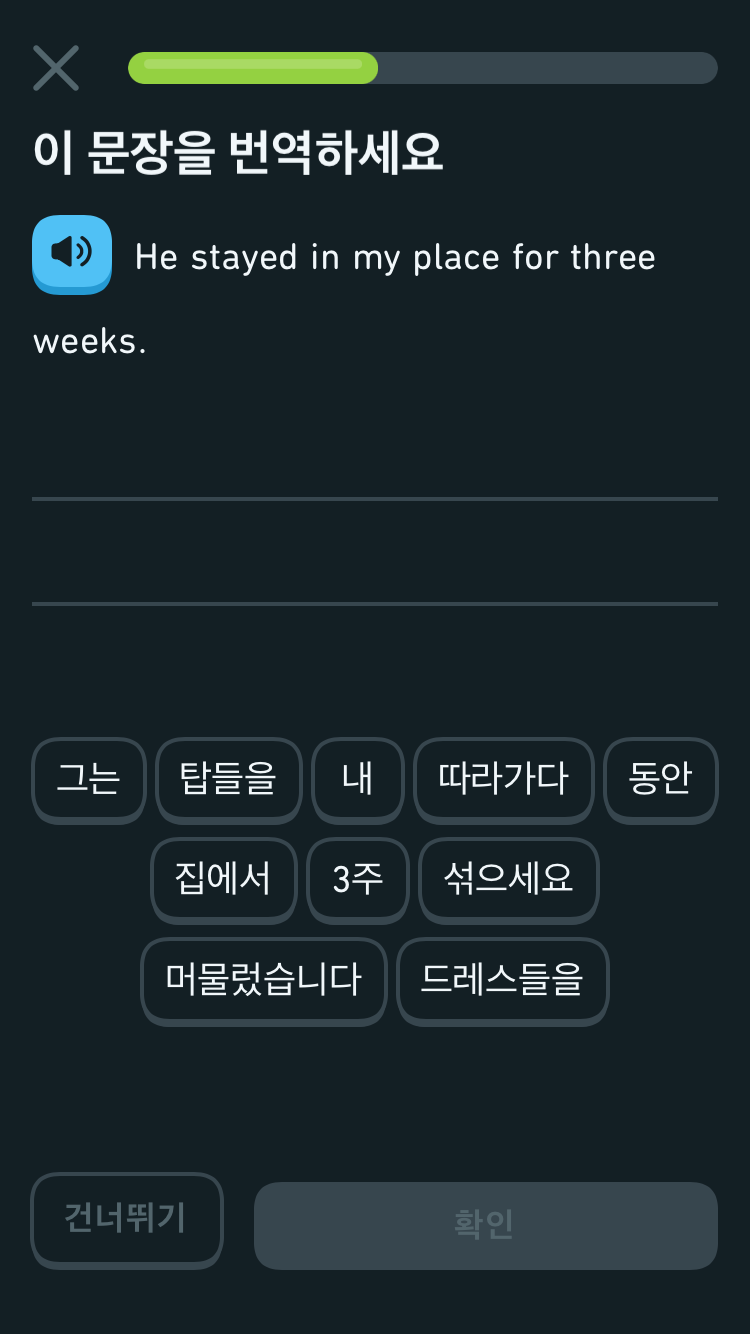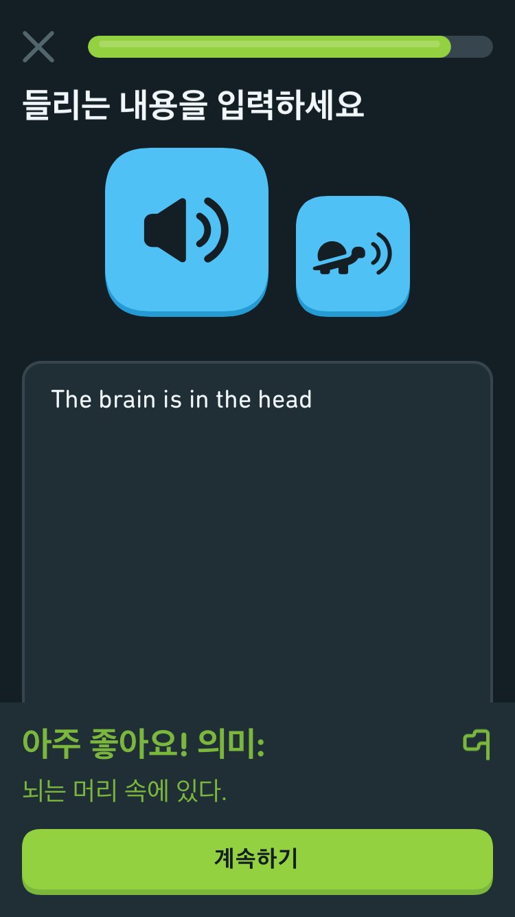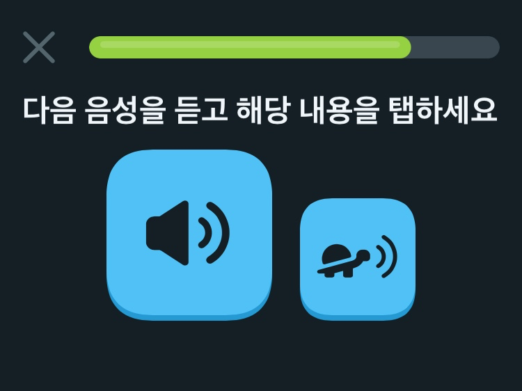 동시에 듣기가 너무 빨리 지나갈 경우 불편을 느낄 사용자들을 위해서 거북이 모양의 느리게 듣기 버튼도 제공하고 있는데, 일반 배속 버튼과 크기 차이를 둔 점도 인상적이었다. 듀오링고는 학습에 포커스가 맞춰져 있는 서비스이고 필요에 따라서 느리게 듣기를 사용할 때도 있겠지만 우선순위는 1배속으로 놓는 것이 바람직하다. 듀오링고는 버튼의 사이즈에 차등을 두어 1배속 듣기를 권장하고 있다고 생각된다. 뿐만 아니라, 사용자가 한 손으로 사용할 수 있도록 단어 단위의 박스를 보기로 제공한 점도 인상적이었다. 사용자는 문장을 썼다 지웠다 반복할 필요 없이 주어진 단어를 탭 하는 것으로 추가했다, 뺐다를 반복할 수 있다.