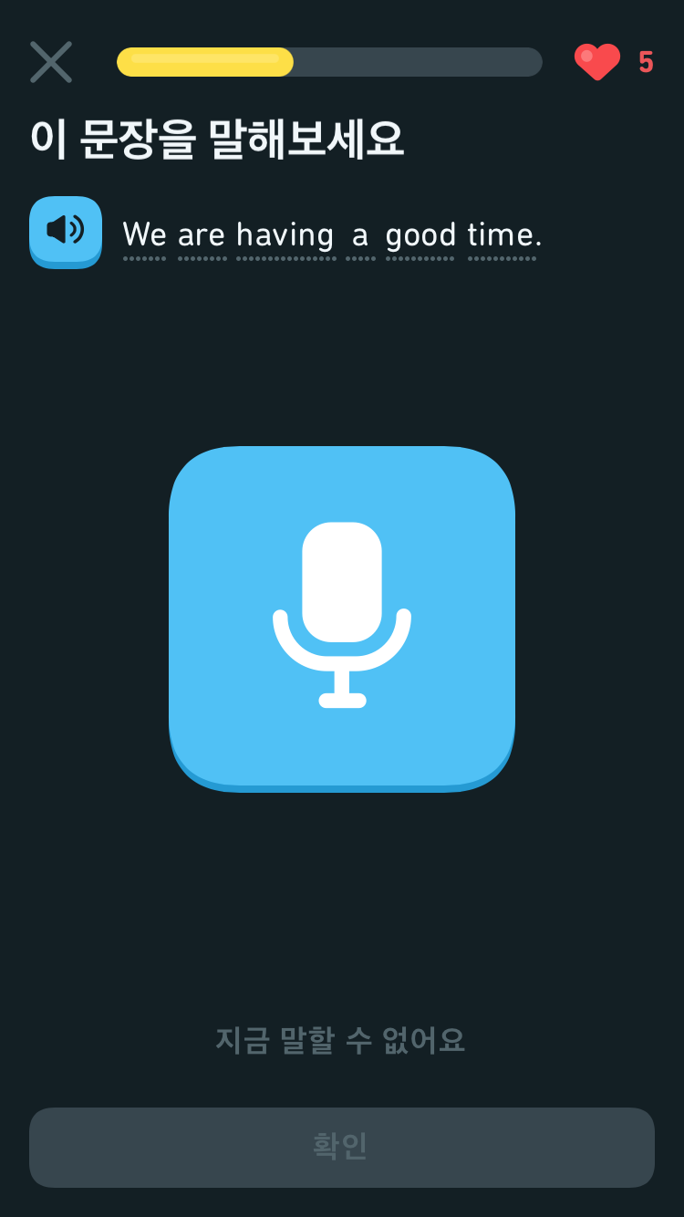 그리고 퀴즈에서 직접 목소리를 녹음해야 하는 스피킹 문제가 등장할 때가 있는데, 마이크를 쓸 수 없는 환경에서 듀오링고를 사용하는 고객들을 위해 지금 말할 수 없어요라는 버튼을 제공하고 있다. 화면 캡처에는 없지만 지금 말할 수 없어요 버튼을 선택하게 되면 듀오링고는 약 1시간 동안 마이크를 사용해야 하는 문제를 배제한다. 듣기 파트에서도 마찬가지로, "지금 들을 수 없어요" 버튼을 통해 스킵할 수 있다.