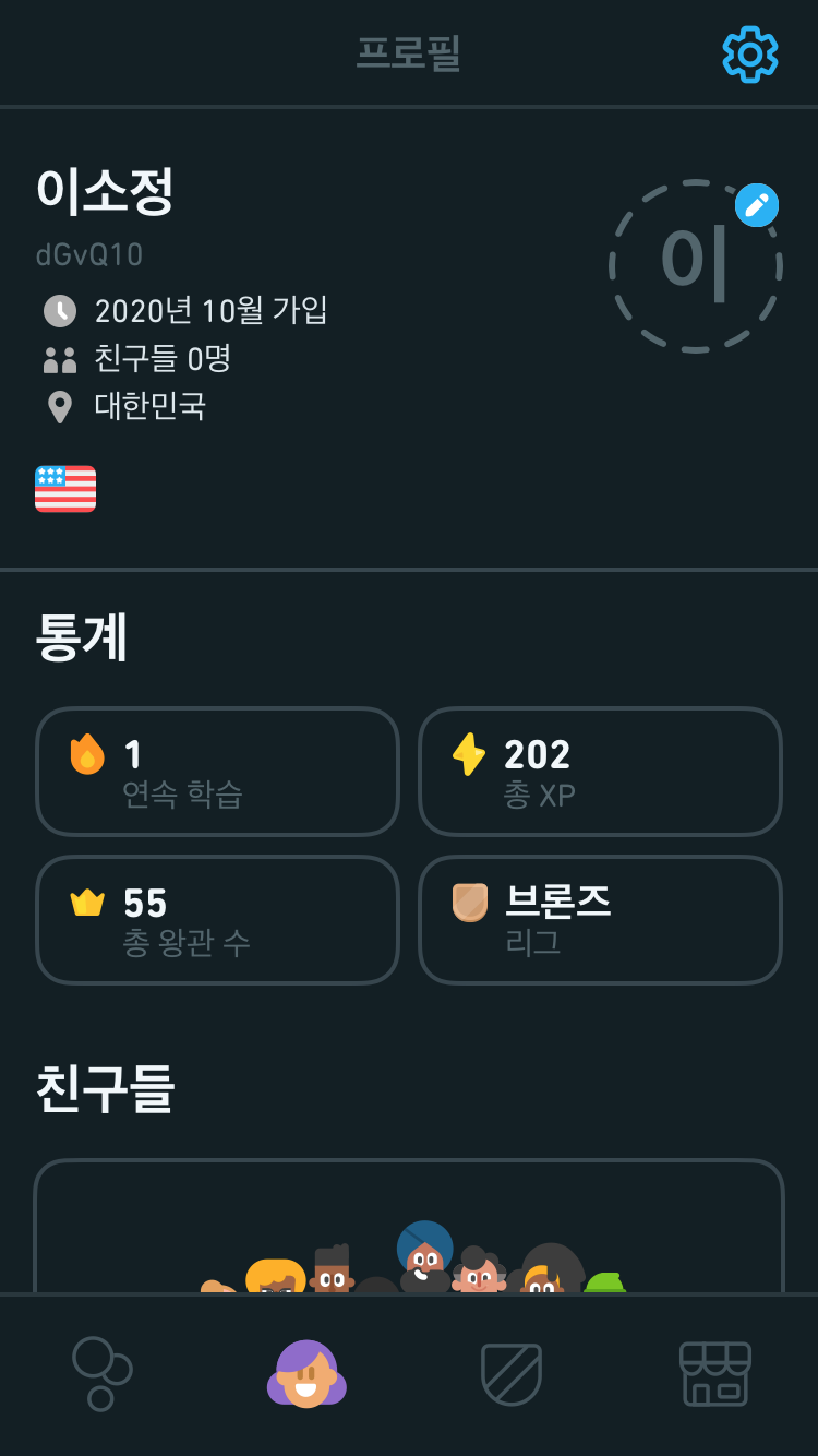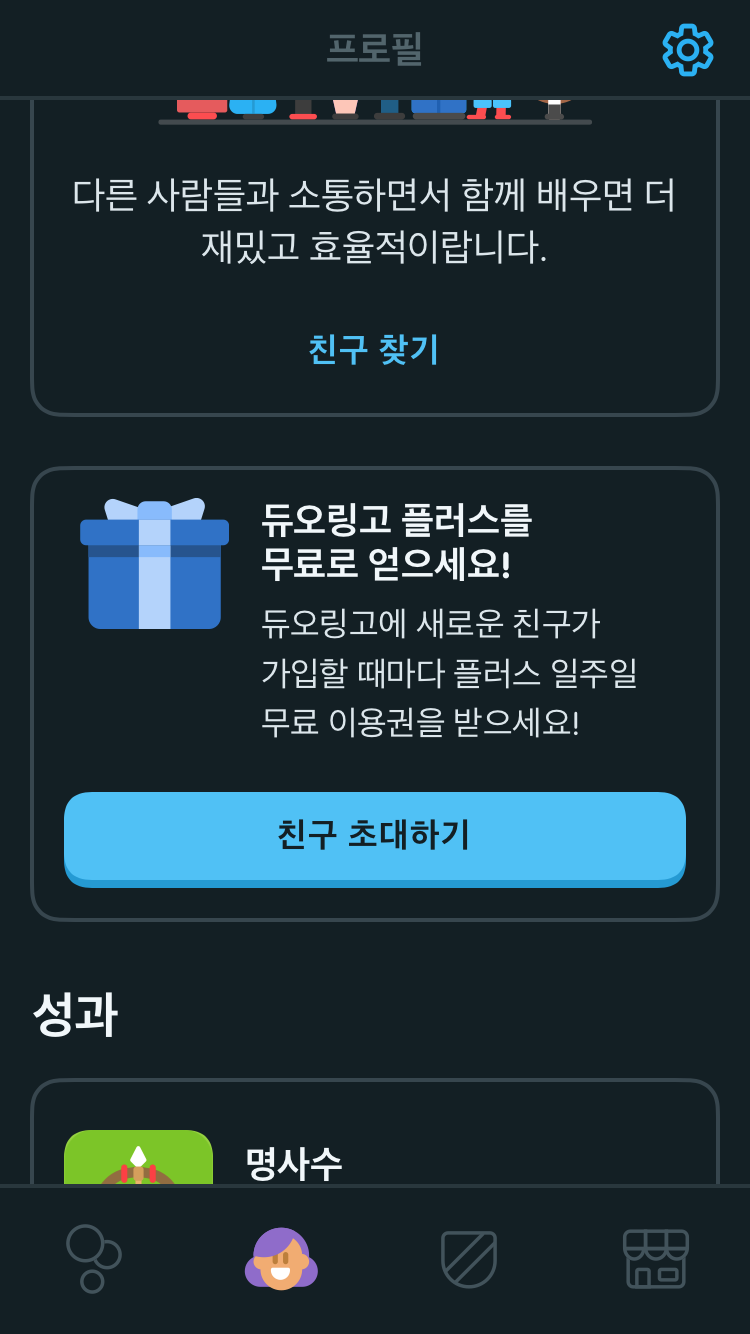 소정 : 프로필 화면을 보면, 네 파트로 나눠져 있어서 나름 정보를 덩어리 처리하여 제공하는 것 같다. 첫 번째 덩어리에서는 이름과 고유 아이디, 가입 날짜, 친구 수, 위치, 배우는 언어, 프로필 사진을. 두 번째 덩어리에서는 학습 통계 정보로 연속 학습 날짜, 총 XP(경험치), 총 왕관 수(완료한 혹은 시험을 통과한 레슨 개수), 리그를 알려준다. 세 번째 덩어리는 친구 찾기와 초대하기 기능이 있고, 다음 덩어리는 성과 덩어리로 10개의 항목에서 내가 어느 정도씩 성취를 했는지 확인할 수 있다. 하지만 초반에 통계가 무엇을 가리키는지 익숙해지지 않은 학습자는 다소 정보가 많은 것으로 느낄 가능성이 있다. 사용자 추천을 늘리려는 앱의 의도로 생각되기는 하지만 친구들이 성과보다 먼저 있는데, 친구들 기능을 많이 활용하지 않는 사람으로서는 불편했다.