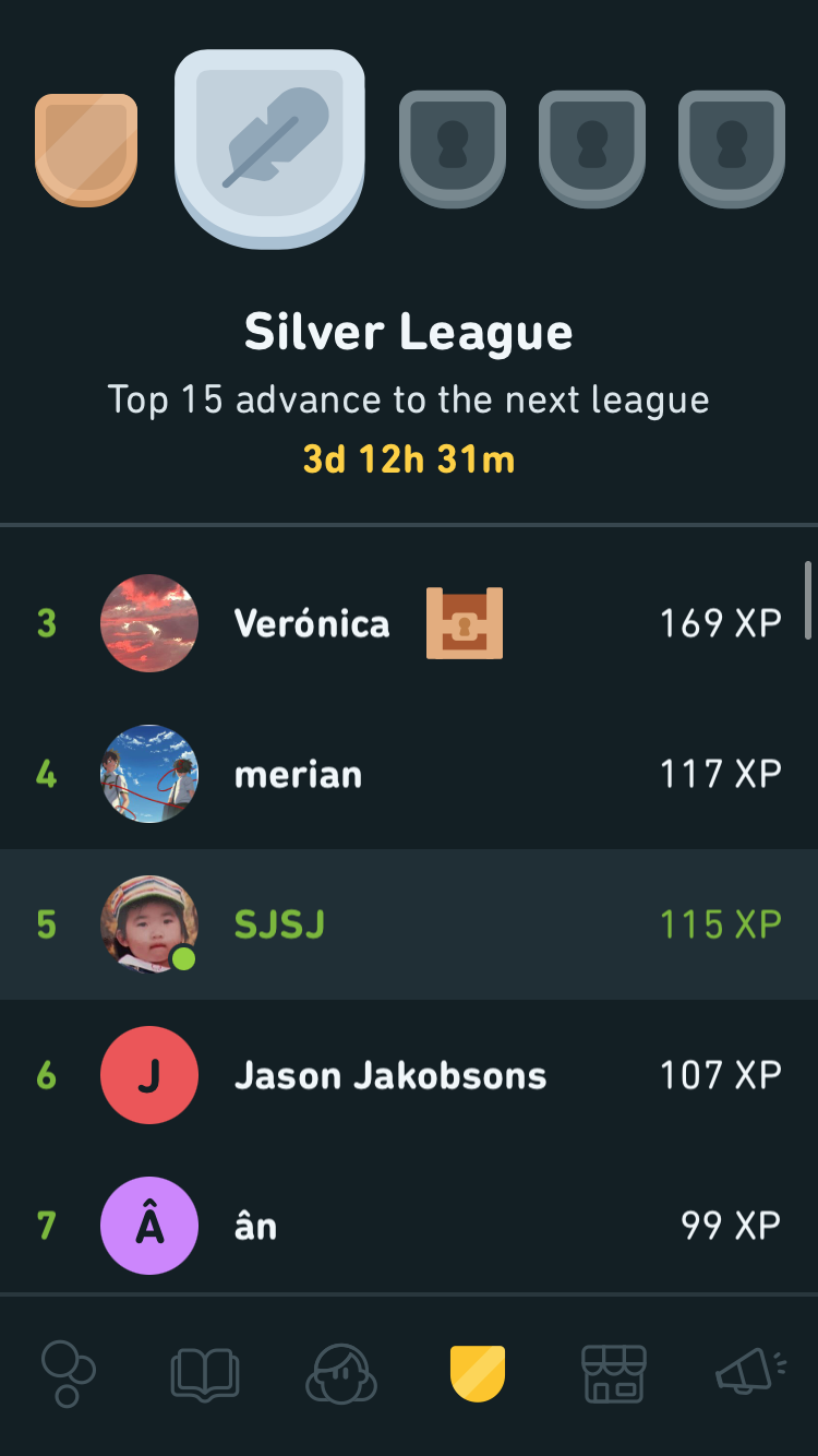 소정 : 경쟁적인 요소는 '리그' 제도를 통해서 찾을 수 있는데, 마치 <리그 오브 레전드>처럼 브론즈, 실버, 골드, 사파이어, 루비, 에메랄드, 자수정, 펄, 흑요석, 다이아몬드의 10개의 리그로 나눠져 있다. 일주일 단위로 계산해서 그 주에 얼마나 학습했는지에 따라 리그가 나뉘고, 한 리그 당 50명씩 들어간다. 그리고 이 중에서 상위 사용자 10명은 다음 리그로 진출하고, 하위 사용자 10명은 이전 리그로 돌아가게 된다. 상위 3위에 든 사용자는 보석 등 추가적인 보상을 준다. 같은 리그의 사용자를 팔로우할 수도 있고, 그 사용자의 학습 그래프에 접근할 수도 있다.