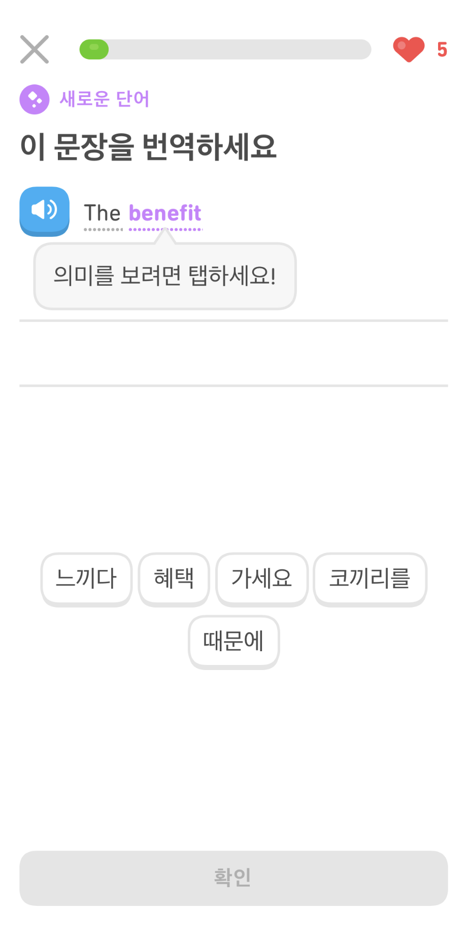 아영 : 듀오링고는 온보딩 과정의 레벨 테스트를 통해(왼쪽 이미지) 미리 사용자에게 듀오링고의 사용법을 자연스레 익히게 하고 있다. 사용자는 일련의 퀴즈를 통해 앱의 동작법을 익히게 되며, 동시에 듀오링고는 사용자의 언어 학습 수준을 측정하여 그에 맞는 커리큘럼을 추천해주고 있다. 또한 퀴즈 화면에서는 오른쪽 화면과 같이 의미를 보려면 탭 하세요!처럼 말풍선 형태의 팝업이 발생되는데, 이는 유저는 '무언가를 동작하려면 탭을 하면 되는구나' 하고 한 번 더 인지하게(학습하게) 되는 과정이 된다.