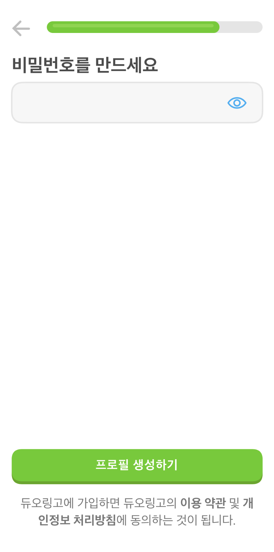 아영, 소정: 듀오링고는 회원 가입 과정에 한 페이지당 하나의 질문만 넣어 사용자의 빠른 응답을 유도했다. 이메일과 비밀번호도 동시에 하나의 창에서 입력하는 것이 아니라, 페이지를 이동하며 이메일-비밀번호 순으로 지정할 수 있게끔 하고 있다. 듀오링고의 중요한 부분은 모두 한 화면에 하나의 정보만 넣을 수 있도록 되어 있다. 예를 들어, 회원가입 화면이나, 문제풀이 화면은 하나씩 정보를 입력해야 다음 단계로 넘어갈 수 있다. 회원 정보를 입력하거나, 답변을 골라야 해서 이미 두뇌 활동이 이뤄져야 하는 환경에서는 정보가 최소화되어 있음을 확인할 수 있다.