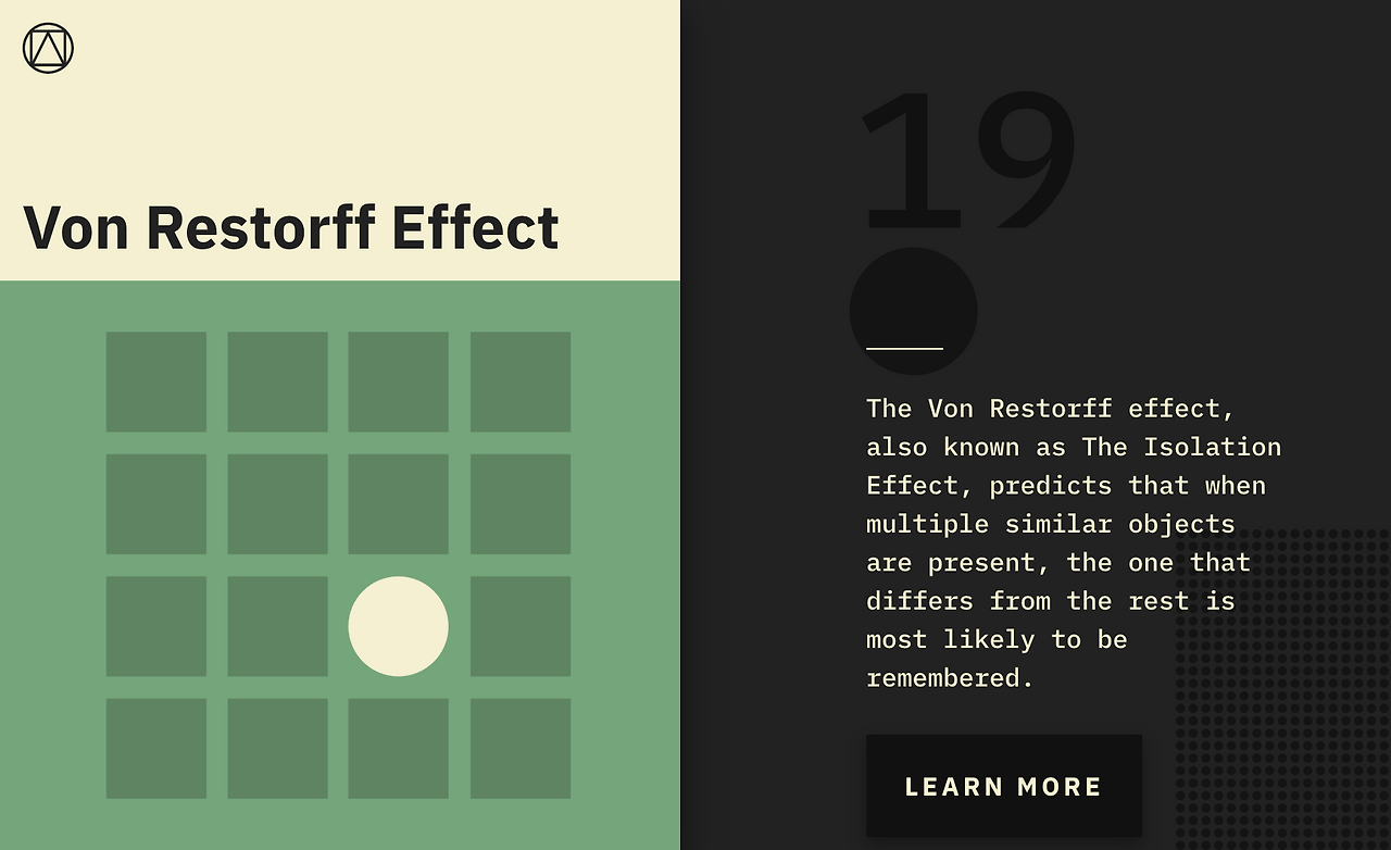 The Isolation Effect로도 불리며, 여러 개의 유사한 개체가 있을 때 나머지 개체와 다른 개체가 함께 기억될 가능성이 가장 높다고 예측하는 효과이다. 고로 중요한 정보는 시각적으로 눈에 띄게 해서 이외의 개체와 격차를 두어 경쟁을 피하여야 하고, 가장 중요한 항목이 우선순위가 떨어지는 정보라 판단되게 두어서는 안 된다는 것. 듀오링고는 인터페이스 요소로 입체적인 CTA 버튼을 각 기능 하단에 제공하고 있어 찾아보기 어렵지는 않았다.