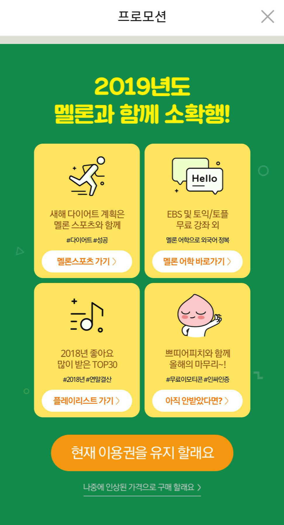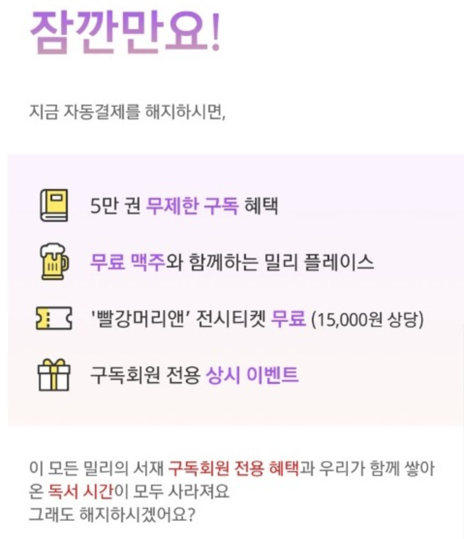 위의 방식은 사용자의 입장에서 볼 때 가끔씩은 짜증이 올라올 때도 있는, 구독취소만으로 무언가 대단히 손해를 보는 듯한 느낌(?)을 주는 유형들이다. 사용자가 현재 누리고 있는 혜택을 모두 보여주고, 구독을 해지하게 되면 잃게 될 혜택들을 강조한다. 이미 서비스에 애정이 식은 사용자라면 이러한 장치를 보고 오히려 마지막 인상까지 나빠지는 역효과가 일어날 수도 있지만, 모종의 이유로 불가피하게 이용권을 해지하려고 했던 고객들은 다시 한번 구독해지를 재고해볼 수도 있다.