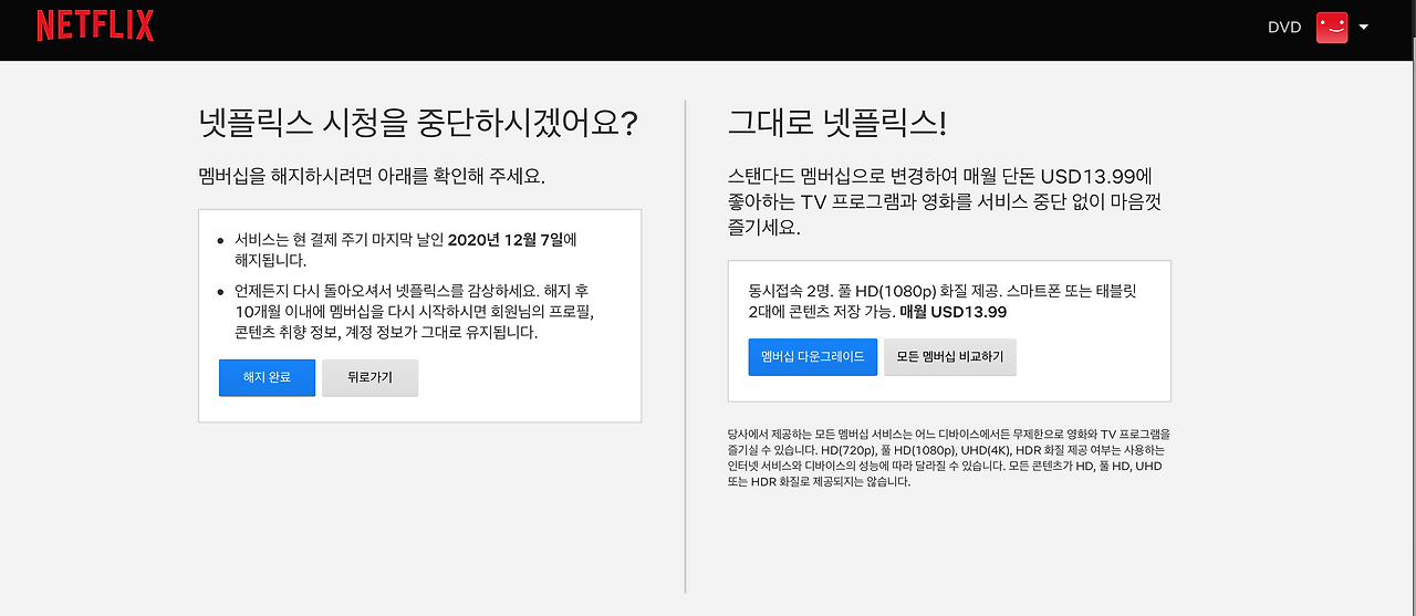 사용자들은 각기 다른 이유로 구독 취소를 결심한다. 자신이 보고자 하는 콘텐츠가 해당 서비스에는 존재하지 않아서, 내는 구독료에 비해 매달 서비스에 할애할 수 있는 시간 자체가 적어서 혹은 단순히 비싼 요금제 탓일 가능성도 배제할 수 없다. 넷플릭스는 구독을 취소하려고 하는 고객들에게 멤버십 다운그레이드 버튼을 제공하여 서비스의 구독을 완전히 취소하지 않도록, 다른 대안이 남아있으니 충분히 검토해 보도록 제안하고 있다. 살펴보면 화면의 배치도 주목할 만하다. 마치 구독 취소와 멤버십 변경이 같은 중요도를 가진 정보인 것처럼 두 가지 선택지를 동일한 계층에 표시한 점도 재미있다.