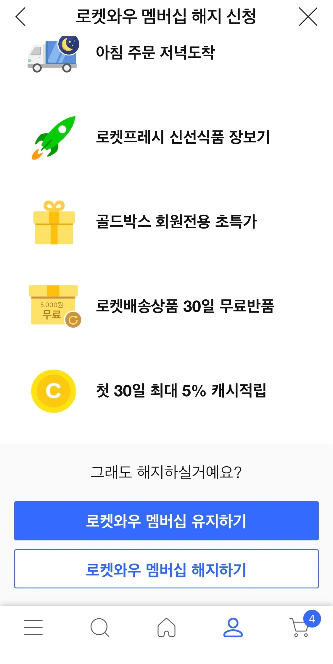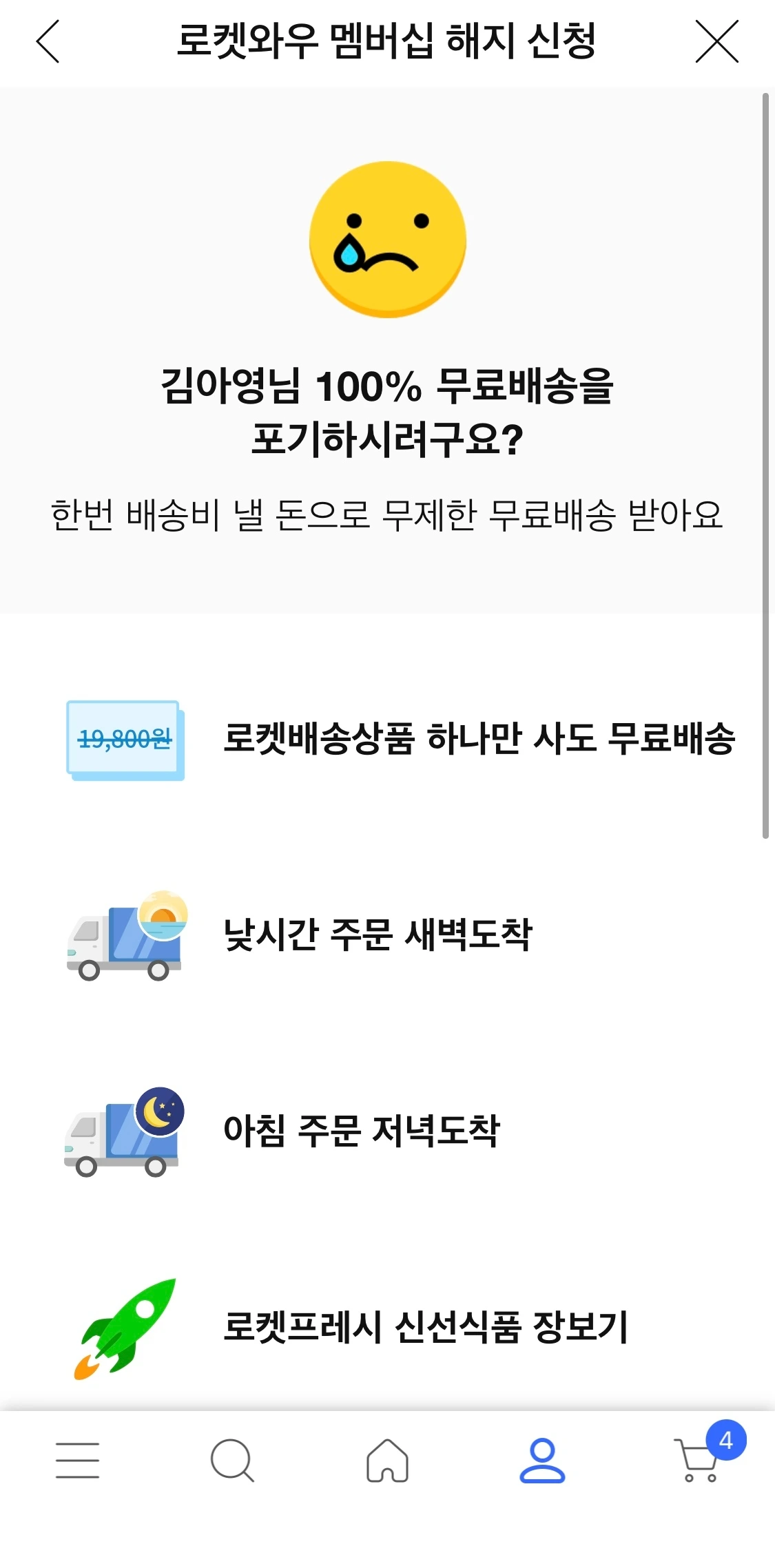 쿠팡의 로켓와우(구독형 무료배송 클럽) 역시도 서비스를 해지하려고 하면 이러한 혜택들을 포기하지 말아 달라 눈물로 호소한다(?) 사용자가 유혹을 이겨내고 멤버십 해지 버튼을 눌러도, 왼쪽과 같은 창이 또 한 번 발생된다.