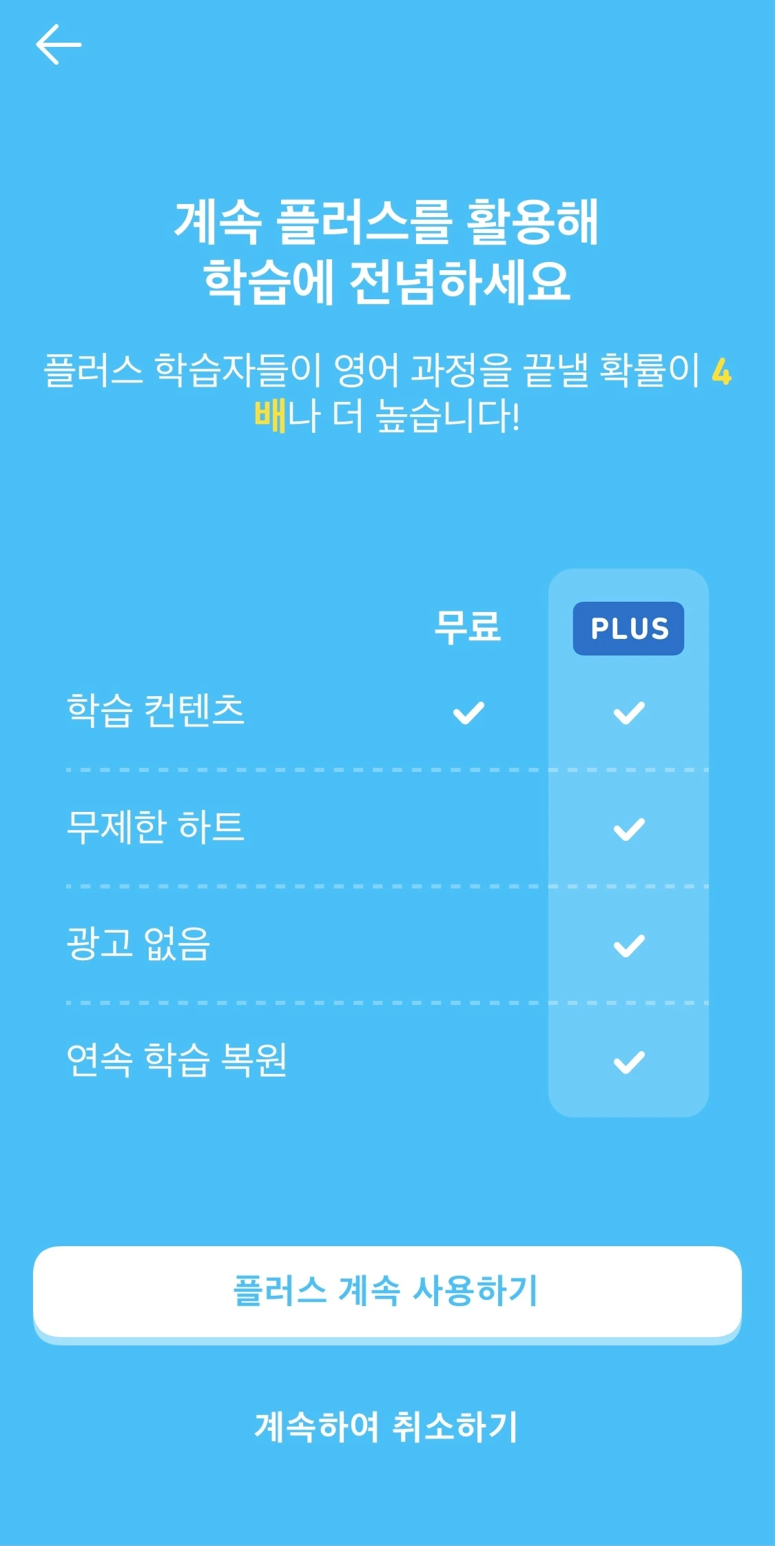 언어 학습 앱인 듀오링고는 유료 구독형 플랜(듀오링고 플러스)을 해지하려고 할 시, 무료 플랜 대비 듀오링고 플러스가 가진 장점을 시각화하여 '왜 구독을 유지해야 하는지' 그 이유를 비교의 방식으로 보여준다. 단순히 구독형 플랜이 가진 이점을 나열하는 것이 아니라, 무료 플랜에서는 누릴 수 없는 혜택이라는 점을 비교하는 방법으로 혜택을 다시 상기시켜 플러스 요금제를 구독유지하도록 유도하고 있다는 점이 다소 색달랐다.