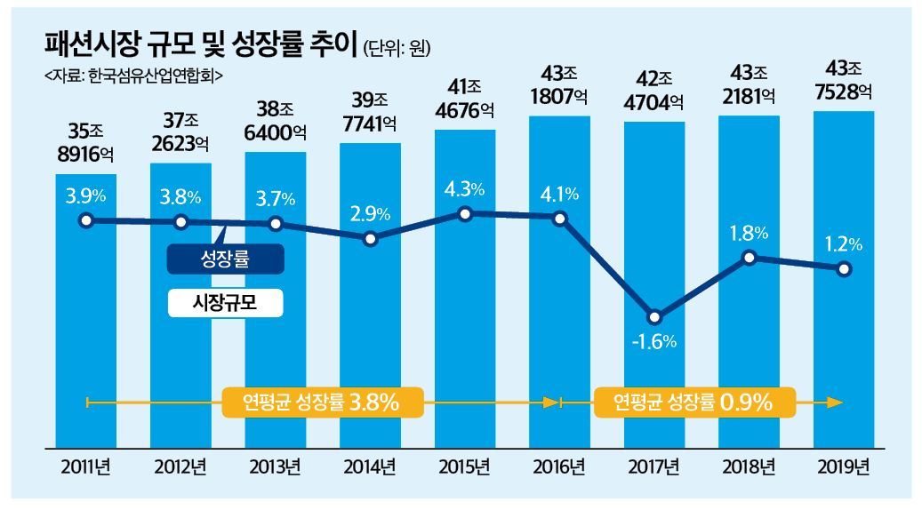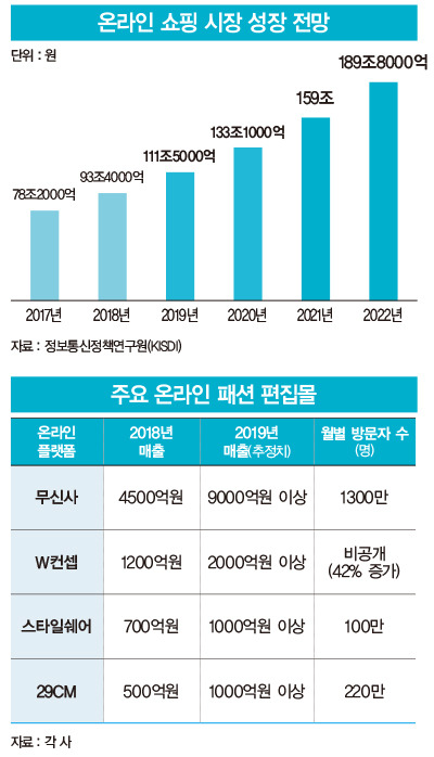 정보통신정책연구원의 통계에 따르면, 2017년부터 온라인 쇼핑 시장의 규모는 가파르게 성장해오고 있으며 2020년 현재는 약 133조 수준으로 추정된다. 그렇다면 패션시장(오프라인 포함)만 놓고 보았을 때는 어떨까? 2018년과 2019년 사이 전체적인 패션시장 규모를 보면 성장률이 0.9%나 하락했음에도 불구하고, 온라인 패션 편집몰의 MAU와 매출은 두 배 가까이 증가했다.