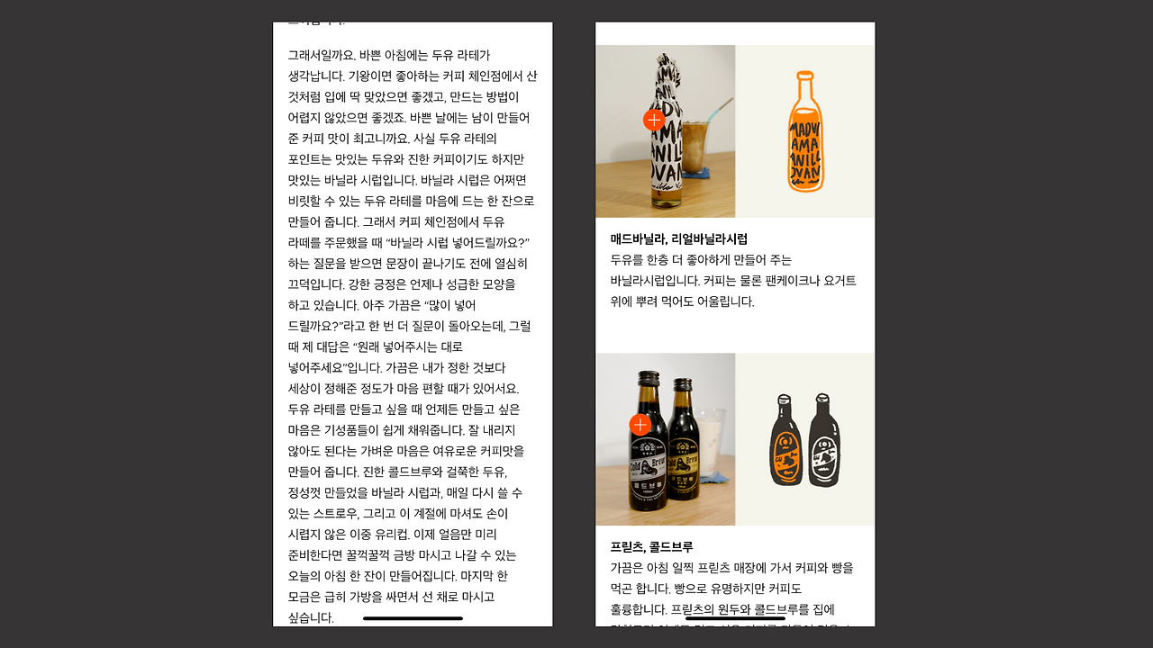 WELOVE 탭은 앞서 정보구조에서 살펴보았듯, 읽기에 특화된 콘텐츠를 사용자에게 제공하고 있다. 흥미로운 점은 이렇게 글을 읽으면서 연관 상품을 구매할 수 있다는 점인데, 이런 추천이라면 누구나 수백 번이고 받을 의향이 있지 않을까? (본인이 활자 중독자라면 지나치기 어려울 것) 유명 에세이스트가 작성한 글을 읽으며 그 속에 등장하는 커피를 직접 만들어 마실 수 있도록 관련된 아이템을 추천해주는 방식은 얼핏 보기엔 '정말 사람들이 살까?' 하는 생각이 들지만, 이미 브랜드와 라이프스타일 아이템에 밝은 29CM 사용자들의 감성을 자극하기엔 더없이 효과적인 큐레이션일지도 모른다.