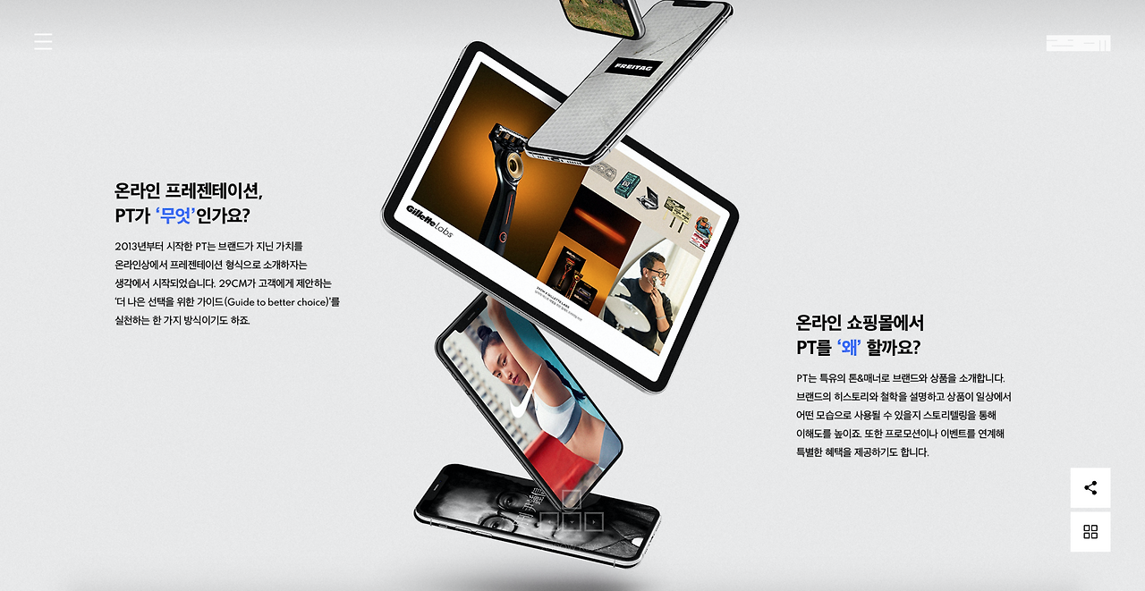29CM의 PT나 스페셜오더, 쇼케이스 역시도 위와 같은 측면에서 제공되고 있는 제안들이다. 보여지는 형식의 차이일 뿐, 29CM의 큐레이션은 브랜드와 고객을 친밀하게 이어주는 방식으로 동작하고 있다. 보통의 쇼핑몰에선 상품의 이미지 정도만 확인할 수 있는 것이 일반적이나 29CM는 브랜드 스토리, 제품 실착용 영상 등 다양한 형식의 미디어 콘텐츠를 통해 다각도로 상품과 브랜드를 조명하고 있다.
