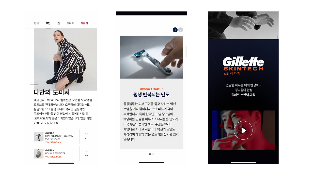 대부분의 쇼핑몰, 편집샵은 오른쪽 화면과 같이 현재 인기 있는 상품의 리스트를 메인에 띄워주고 있고 있다. 반면, 29CM는 자신들의 홈피드를 왼쪽 화면과 같이 활용했다, 한 화면에 최대한 많은 상품을 보여주는 방식이 아닌, 상품을 덜 보여주더라도 이미지나 영상 위주의 콘텐츠에 집중하는 방식을 택했다. 오롯이 한 화면에 담을 수 있는 상품의 수에는 차이가 발생하겠지만, 무한 스크롤 형태의 피드라는 대안을 통해 이를 극복하고 있는 모양세다. 내려도 내려도 계속 새로운 상품과 콘텐츠가 보이는 것이 29CM 홈피드만의 매력이다.