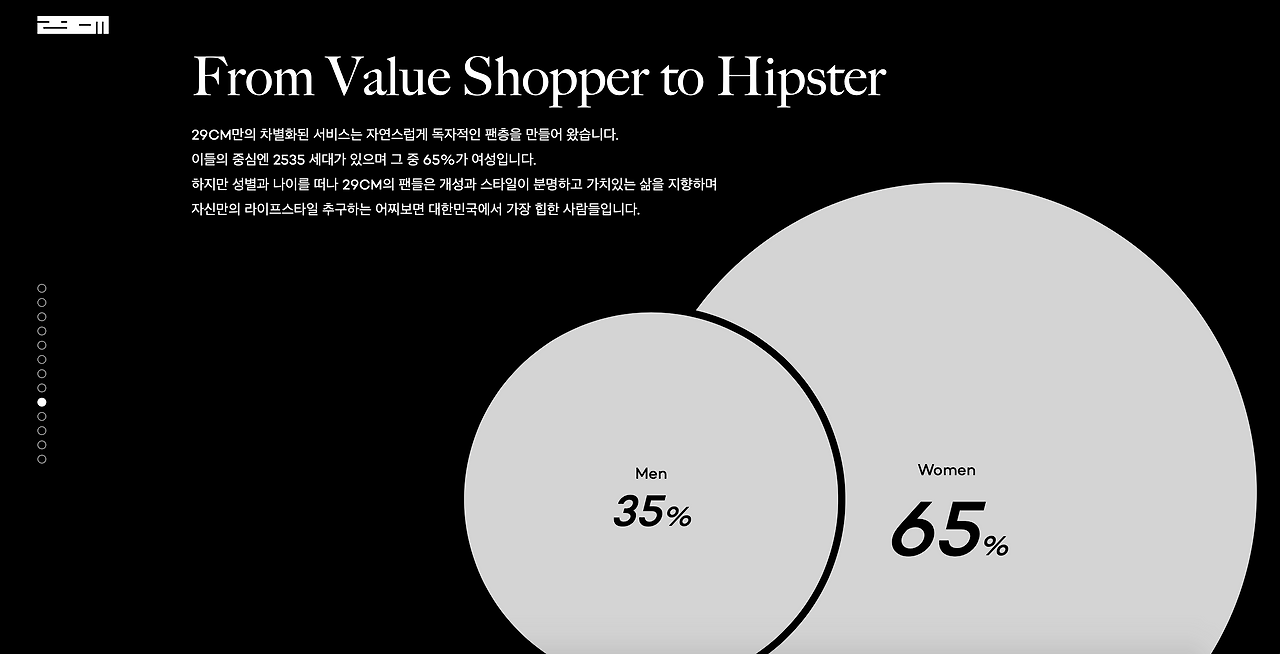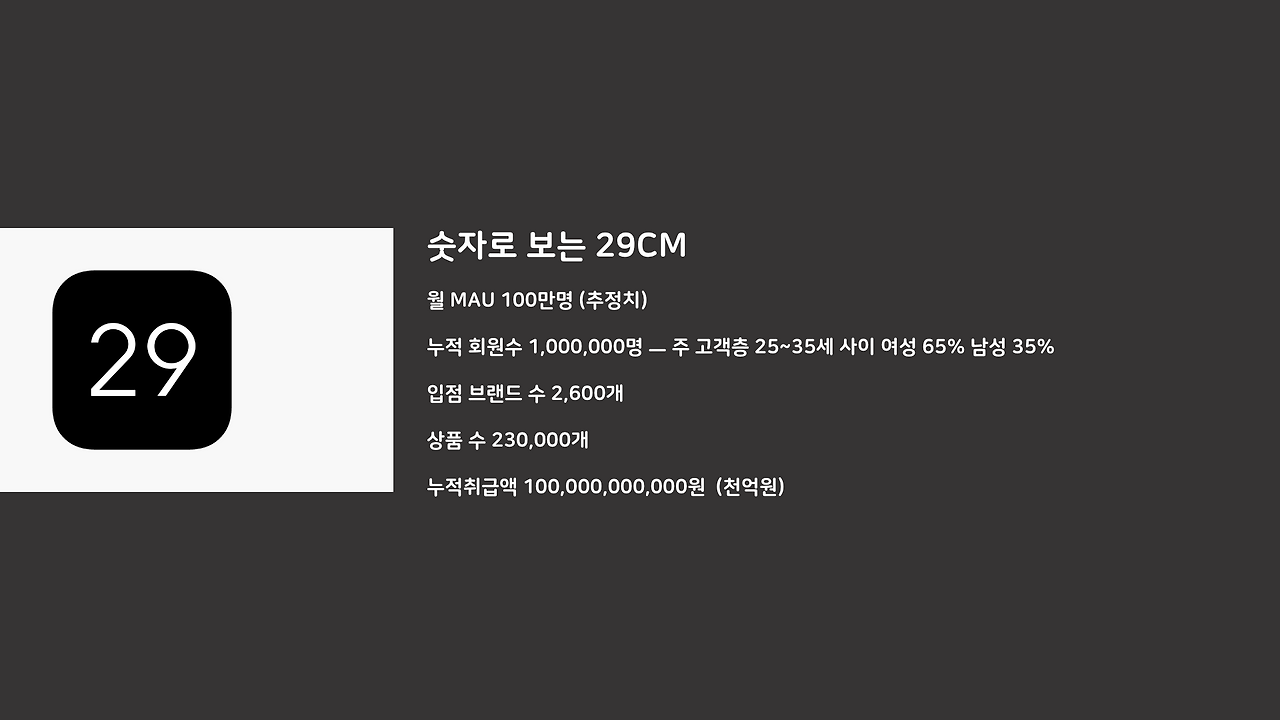 "고객 분석을 해보니 20대 중반에서 30대 중반의 여성 고객과 20대 후반 이후의 남성 고객이 주 고객층이었습니다. 29CM 고객의 검색어를 분석하면 특이한 점이 있는데, 브랜드 검색 비중이 굉장히 높습니다. 그만큼 스스로 선호하는 브랜드가 명확합니다. 트렌드를 빠르게 접하면서도, 자신만의 개성을 중요하게 생각합니다. 라이프스타일 전반에 관심이 높아 패션 역시 그 일부로 소비합니다. 최근에는 여행, 공연, 전시 등 여가와 문화 코드에 대한 반응이 높게 나타나고 있지요"