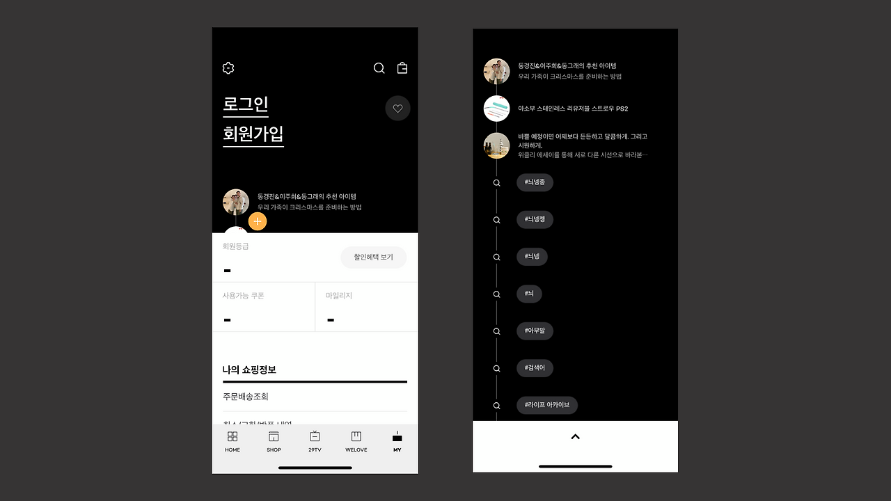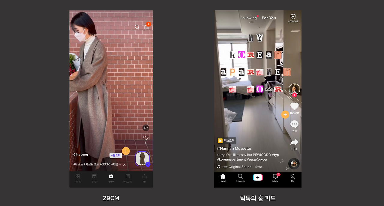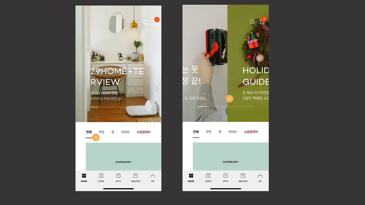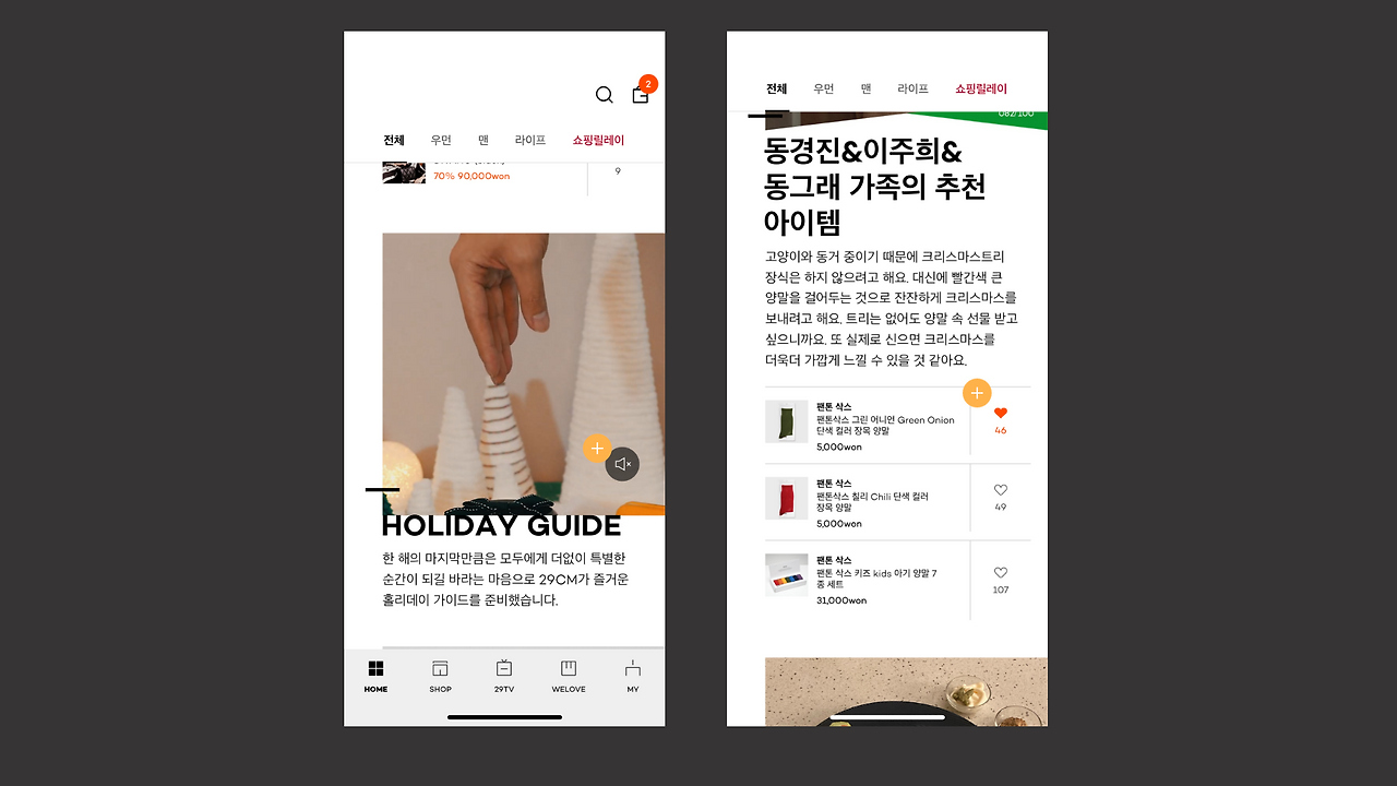반면, 29TV와 WELOVE 탭은 29CM만의 콘텐츠 역량이 돋보이는 탭이다. 29CM가 직접 선별한 것으로 보이는 콘텐츠들을 해당 탭을 통해 감상할 수 있는데, 이 역시도 결국 제품의 구매와 직간접적으로 연결되는 기능이라 볼 수 있다. 여기서도 WELOVE 탭과 29TV의 차이점이 발생되는데, WELOVE 탭의 게시글들은 '읽기'에 특화된 기능인 반면, 29TV는 터치하자마자 브랜드들의 제품 소개 영상으로 연결된다. 즉 '시청하기'에 더 가까우며, 이는 틱톡의 피드를 연상시키기도 한다.