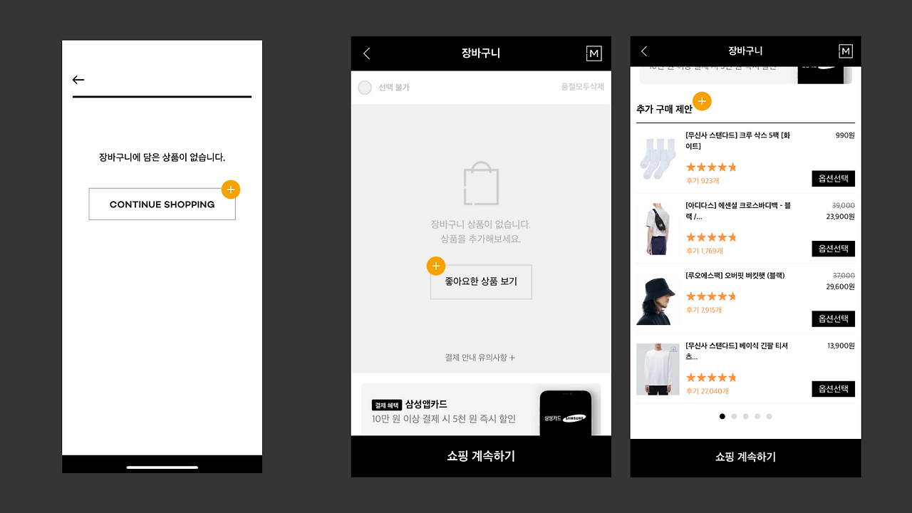 앞서 본 내용처럼 29CM는 검색창의 빈 공간을 추천의 용도로 잘 활용하고 있었지만, 장바구니는 어떤 연유에선지 비워둔 상태였다. [장바구니에 담은 상품이 없습니다.]라는 짧은 안내 문구와 함께 계속해서 쇼핑을 할 것을 권유하고 있는 왼쪽의 화면이 29CM의 인터페이스다. 그리고 빈 장바구니의 중앙에 위시리스트를 확인할 수 있는 버튼을 배치하고, 추가 구매 제안을 하고 있는 두 화면은 무신사의 인터페이스다. 한눈에 봐도 확연한 차이가 느껴진다.