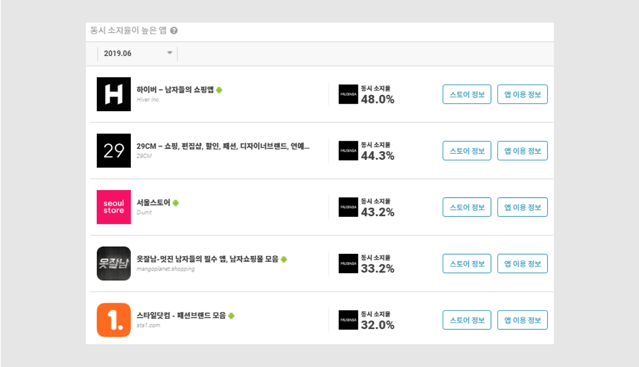 위는 29CM의 회사 소개 페이지인데, 이 페이지만 봐도 전체적인 구조가 눈에 들어온다. 우선, 본문에서 정의하고자 하는 서비스의 Primary user는 옷 또는 잡화를 구매하고자 하는 고객들이다. 이 고객들은 패션에 관심이 많은 사람들일까? 관련 통계를 찾아보니, 아래와 같은 통계를 찾을 수 있었다. 29CM 앱을 사용중인 유저의 절반에 가까운 수치가 무신사 앱을 동시 소지하고 있었으며, 무신사를 사용중인 유저들은 아래와 같은 쇼핑몰 앱 역시 사용중에 있었다. 이는 남성 사용자의 동시소지율 통계이고, 실제 사용층의 성비는 남성보다 여성이 높았다. 매달 활성사용자 수는 100만명(공식 홈페이지 참고) 수준이며 그 중 65%가 여성, 35%가 남성이다. 고객들의 주문 객단가는 10만원 수준이나, 재주문 고객의 객단가는 12만원 선이라고. (2018.12 기준)