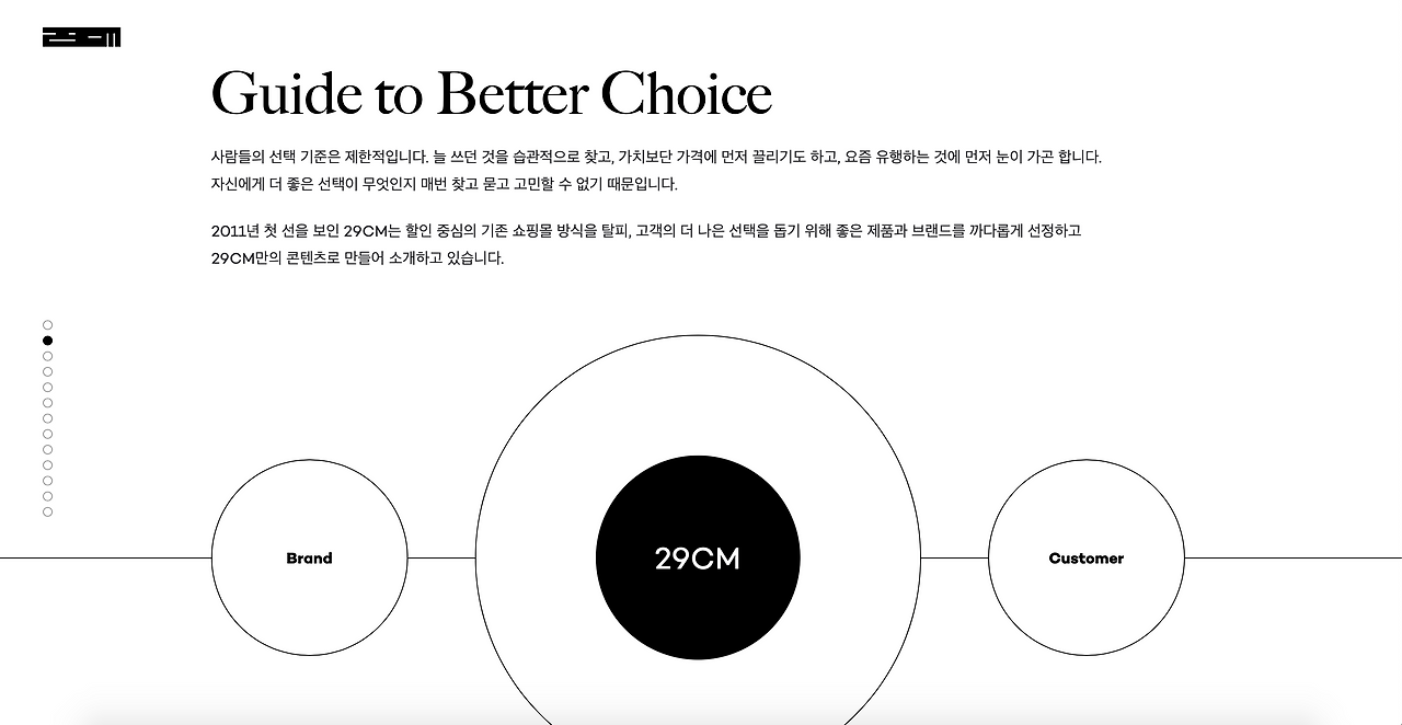 이는 29CM의 공식 슬로건이자 미션이다. 실제로 29CM는 고객이 더 나은 선택을 할 수 있도록 다양한 정보를 제공하고 있다. 이들이 말하는 더 나은 선택이란 비단 저렴한 가격만을 뜻하는 것은 아닐 듯하다. 29CM의 고객 입장에서 느끼는 바지만, 이 서비스는 박리다매와는 거리가 멀다. 최저가 상품을 파는 곳에서 옷을 구입하고 싶다면 다른 서비스를 찾는 편이 좋을 지도 모른다. 29CM가 타 커머스 대비 유달리 독특하게 느껴지는 이유는 이들이 선보이는 제품들에는 이야기가 담겨있기 때문인 듯 하다. 옷을 냅다 '요즘 잘 팔리는 코트입니다. 저렴하죠? 사세요.' 라고 하지 않고, 제품에 담긴 브랜드 철학과 함께 곁들이면 좋을 상품들 그리고 시즌에 맞는 제품들을 적절하게 추천해 준다.