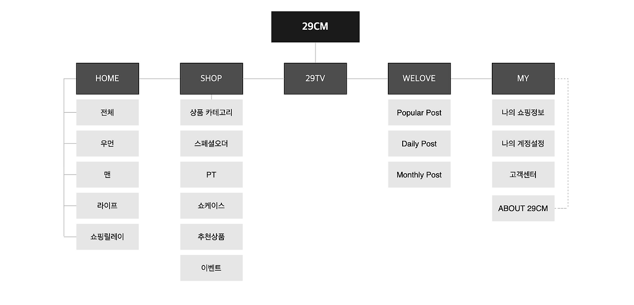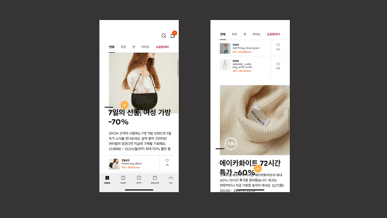 29CM의 정보구조는 크게 쇼핑과 라이프스타일에 중점이 맞춰져 있다. 먼저 사용자는 네비게이션 하단의 홈 탭과 SHOP 탭을 통해 사용자는 물건을 구매하거나 추천받은 브랜드의 상품을 둘러볼 수 있다. 사용자가 홈 피드에서 우먼-맨-라이프스타일 아이템-쇼핑릴레이 탭을 터치하면 선택된 탭에 맞는 피드가 보이는 식이다. 쇼핑릴레이에서는 현재 할인 중인 제품을 소개하고 있다.