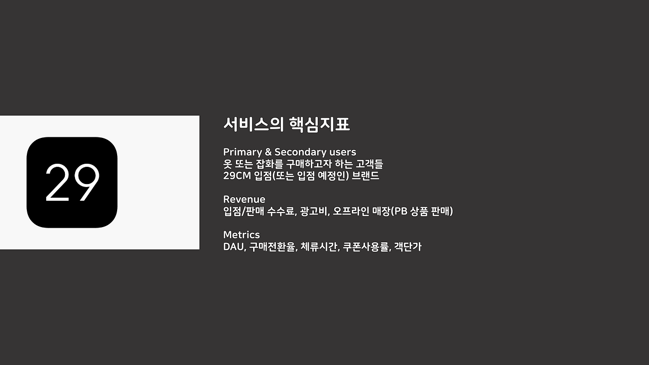 현재의 29CM는 앞서 말했듯, PT와 쇼케이스 그리고 29TV라는 채널을 통해 다양한 입점 브랜드를 고객에게 미디어 콘텐츠의 형태로 소개하고 있다. 이는 29CM의 수익원인 동시에 서비스의 정체성과도 연관되는 부분이다. 입점 브랜드들과의 밀접한 파트너십을 추구하고 있는 서비스의 특성상, 자사의 수익 강화를 위해 의류 PB를 런칭하는 것은 다소 무리가 있는 선택 아닐까? 라는 생각이 드는 지점이었다.