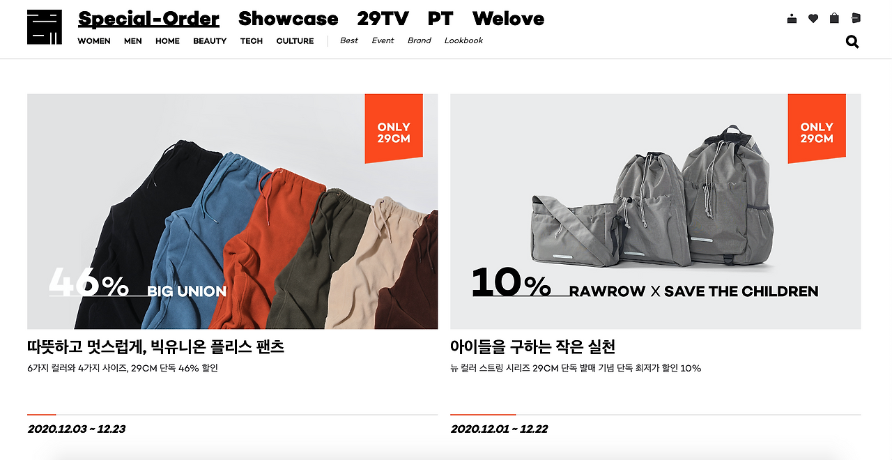 요즘 온라인으로 옷이나 잡화를 구입하는 사람들은 주로 어디서 구매를 할까? 무신사, 지그재그, W컨셉.. 그리고 29CM. 개인의 쇼핑 스타일이나 취향에 따라 다양한 답변이 돌아올 텐데, 나는 주로 29CM를 통해 옷을 구매하고 있다. 이유는 간단하다. 회원 등급에 관계없이 주말, 시즌마다 17~19% 쿠폰을 뿌리는 데다 인터페이스가 예쁘고 편리하다. (여기서 인터페이스가 예쁘고 편리하다는 표현이 다소 추상적으로 들릴 수 있다는 점은 인정한다.)