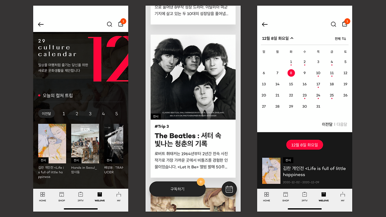 29CM는 WELOVE 탭의 29 컬처 캘린더를 통해 새로운 방식의 문화생활을 제안하고 있다. 이를 구독한 사용자는 다양한 컬처 상품의 할인 혜택과 프로모션을 받아볼 수 있는 것이 특징이다. 의류와 라이프스타일 아이템을 넘어 '이번 달 볼 만한 것'까지 추천하고 있는 29CM. 뉴스레터 서비스처럼 구독형이라는 점도 신선한데, 언제든 쉽게 구독을 해지할 수 있으며 추가적인 비용도 발생되지 않는다. 29 컬처 캘린더는 여러 가지 삶의 형태와 취향을 추천해왔던 29CM와 찰떡 같이 어울리는 기능인 동시에 광고, 제휴 수익을 올릴 수 있는 수익원이기도 하다.