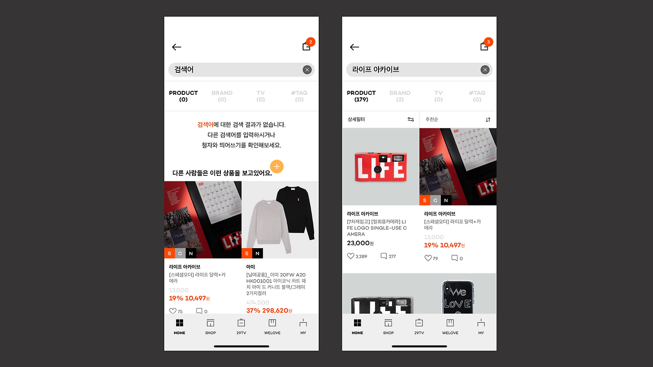 29CM의 돋보기 버튼을 통해 검색을 해봤다. 검색과 일치하는 결과가 있으면, 그것과 연관된 상품을 오른쪽 화면처럼 보여주지만 일치하는 결과 값이 없다면 왼쪽의 화면이 발생된다. 검색어에 대한 결과가 없음을 알리는 문구와 함께 사용자가 허무해하지 않도록 <다른 사람들은 이런 상품을 보고 있어요>라는 추천 영역을 제공하여 빈 여백을 최대한 활용했다. 이는 상품의 구매율 측면에서도 도움이 될 뿐 아니라, 사용자가 헛걸음을 했다는 느낌을 주지 않는다.