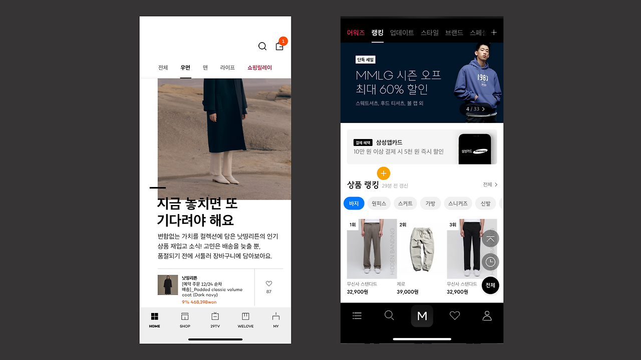 또한 대부분의 e커머스 쇼핑몰 앱을 실행해보면 알겠지만, 잘 팔리는 베스트 상품을 메인 상단에 노출시키고 있는 점을 확인할 수 있다. 이는 MD 제안의 콘텐츠를 메인에 배치한 29CM와 정반대의 방식이다.
