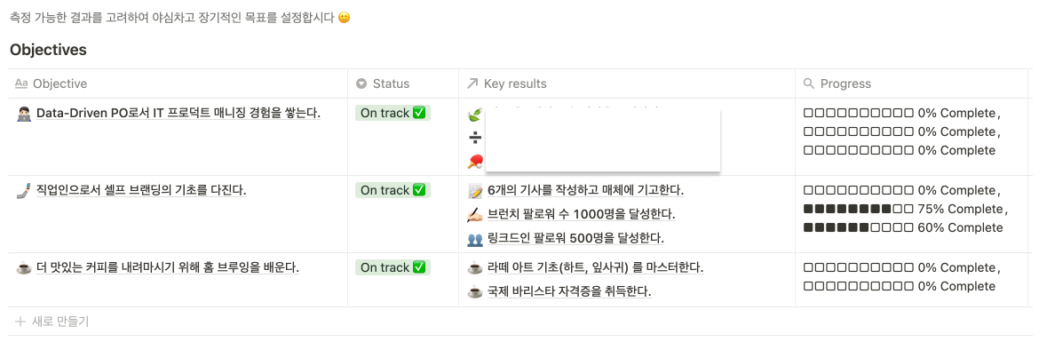 개인적인 목표 관리는 OKRs를 통해 하고 있는데 (쓰다가 갑자기 OKRs는 쓰레기다!라고 외쳤던 한 동료가 생각났다. 번외지만 난 그가 내는 선명한 목소리가 좋았다.) 한 명의 개인에게도 적용할 수 있는 프레임워크라 생각해서였다. 무엇보다 인간의 사적인 자아는 몹시 나약해서(?) 정량적인 목표를 수립하지 않으면, 결국 그 결심이 행동으로 이어지지 않고 수증기처럼 증발하기 마련이라 믿기에.