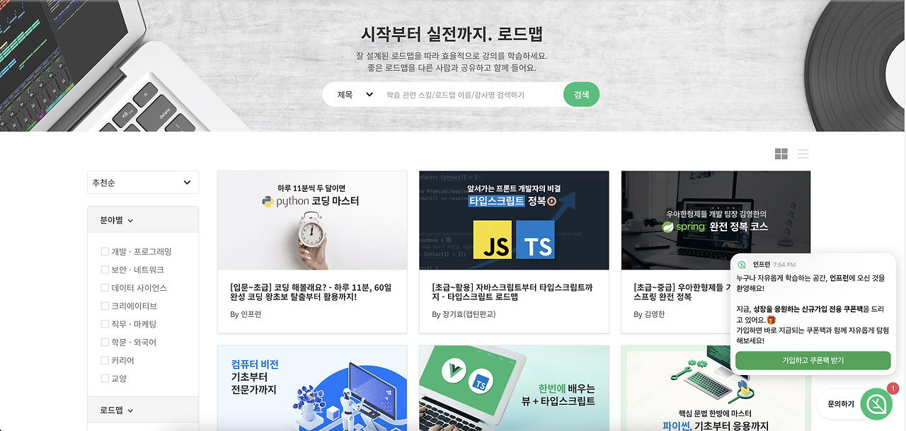 하지만 인프런은 잘 나가는 스타강사가 있다고 해서, 그 스타강사만 띄워준다는 기조의 서비스는 아니었다. 지식공유자들의 콘텐츠가 최대한 다양하고 공평하게 노출될 수 있도록 노력하는 내부적 방향이 있었다. 같은 점에서 강의 썸네일이나 로드맵의 카드 이미지 역시 너무 튀거나 주의를 끄는 이미지를 사용하는 것은 지양하고 있다.