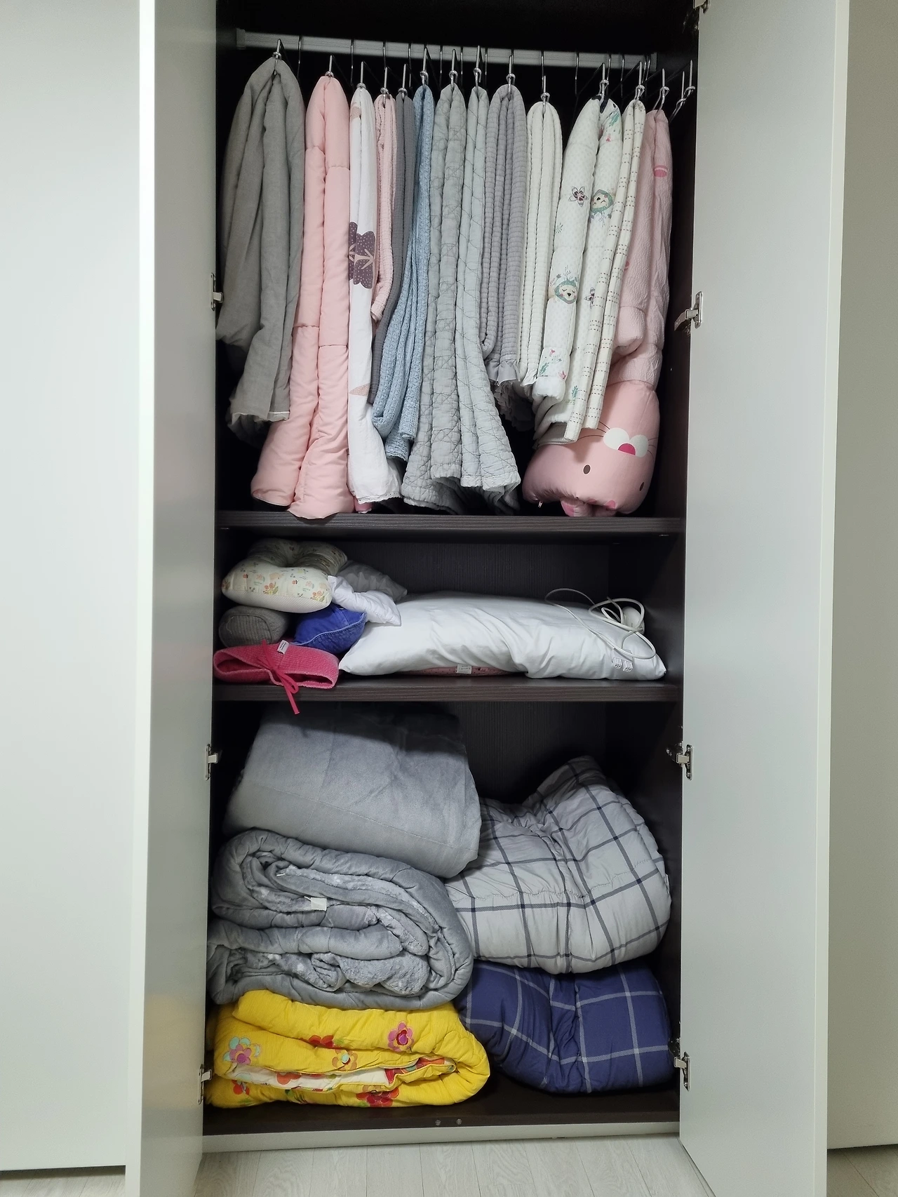 두꺼운 겨울 이불은 두꺼워서 걸 수가 없다. 부피도 커서 넣으면 다른 이불을 몇 개 못 넣는다 두꺼운 이불은 접어서 넣는 걸로 했다.