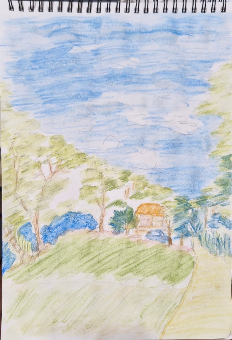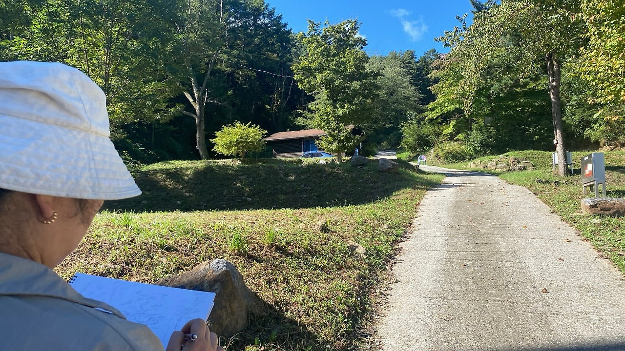 다음날, 엄마에게 그림을 그리라 부추겼다. 아침 먹고 누워 쉬고 있는 엄마에게 계속 눕지만 말고 엄마와 함께 그림을 그리고 싶었다고 이럴 때 그려봐야 되지 않겠냐고 계속 졸라댔다. 못 이긴 척 엄마는 일어나서 숙소 가까운 주변에 자리를 잡고 자신이 보는 풍경을 종이에 옮겨 담았다. 그런 엄마를 나는 사진으로 담았다. 미션 성공이다. 하하하