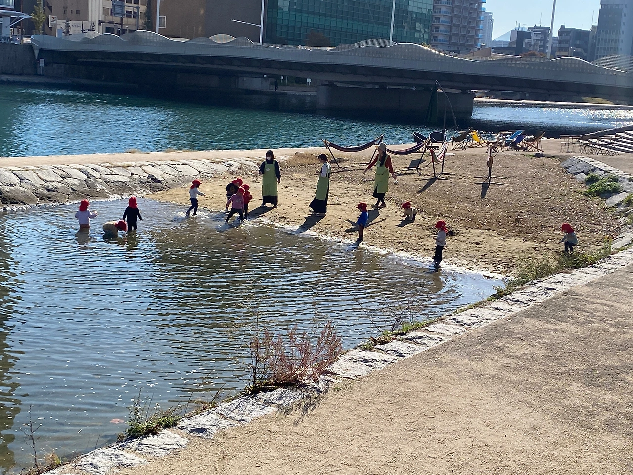 고쿠라성 근처 하천을 거니는데 어린이집 아이들이 물속에서 뭔가 찾으며 노는 모습이 눈에 들어왔다. 5명의 선생님이 15명 정도 어린이를 돌보고 있었는데, 시골이 아닌 도심 하천에서 이렇게 놀 수 있는 게 과연 괜찮을까 지극히 한국적 마인드로 지켜보다가 어쩌면 이렇게 자유롭게 놀게 하는 것이 더 교육적이지 않을까 라는 대화를 같이 간 동료와 나누며 한편으로 부럽다는 얘기로 마무리하였다.