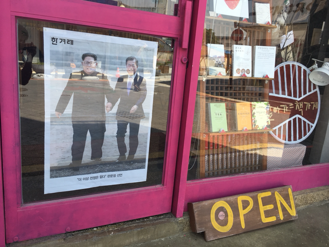 내가 겪는 역사를 기억하고, 내가 그 역사를 만든다고 생각하는 것. 참 중요하다. 4월 27일은 마치 내가 전혀 생각조차 안했던 미지의 세계를 조만간 갈 수 있을 것이라는 기대에 부푼 하루였다. 암튼 선물받은 멋진 신문 1면을 호기롭게 책가게 유리창에 붙여 기념했지만 자꾸 사람이 걸어오는 것 같아 지레 깜짝 놀라했다 -_-