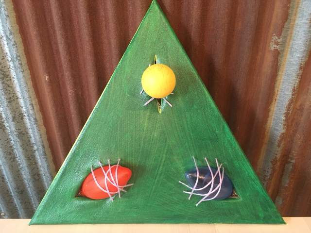 삼각 프레임 캔버스를 왜 샀는지 모르겠지만 새로운 그림을 만들 수 있겠다 싶어서 이리저리 머리를 짜다가 마침 수명이 다된 촛대 전구가 있길래 이걸로 연결해봐야겠다 싶었다. 전구에 색을 칠해보고 지워보다가 색깔을 맞춰보고 캔버스에 배경색을 칠하고 뭔가 더해졌으면 좋겠다 싶어 실을 꿰었다. 그랬더니 연결은 되었는데 괴괴한 그래도 멋진 그림 완성. 헤헤헷