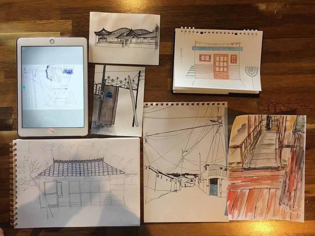 도시-공간-디자인-공부모임에서 두번의 구도심 탐방을 떠났다. 3월 9일은 본격 구도심 탐방을 떠나기 전 오래된 건축 공간에서 건물 드로잉을 맛보기 삼아 해보았다. 일제 때 은행 건물로 쓰였던, 지금은 카페가 된 공간에서 각자가 인상깊게 본 건물을 이야기하고 다양한 드로잉 도구로 그려보았다. 3월 23일은 정말 어메이징 스펙타클한 날씨 덕에 인상 깊은 탐방이었다. 세찬 비바람 속 차 안에서 이런저런 이야기를 나눈 시간이 무엇보다 기억에 남을 것 같다. ㅎㅎ 어쨌든 날씨가 급 개었고 햇살이 빨리감기 하듯 땅을 비췄다. 차 안에서 나와 향교동을 걸었다. 사연 없는 빈집들과 그 틈들을 둘러보고, 작은 향교도 둘러보고, 골목의 변화를 아는 이의 이야기를 들으며 여럿이 걸었다. 그리고 근처 카페에서 각자 본 건물을 그리는 시간을 가졌다. 나는 건물에 기댄 낡은 전봇대, 역할을 못하는 대문을 그렸다. 못 그린다 못 그린다 해도 그리고 보면 꽤 괜찮은 느낌이 드는 것은 생각과 행동이 이어져서 나오는 감탄과 연결되는 무엇이 아닐까 하는 생각이 들었다. 혼자 하는 것도 재밌겠지만 공간을 관찰하는 다양한 취향을 볼 수 있어서 재밌었다.