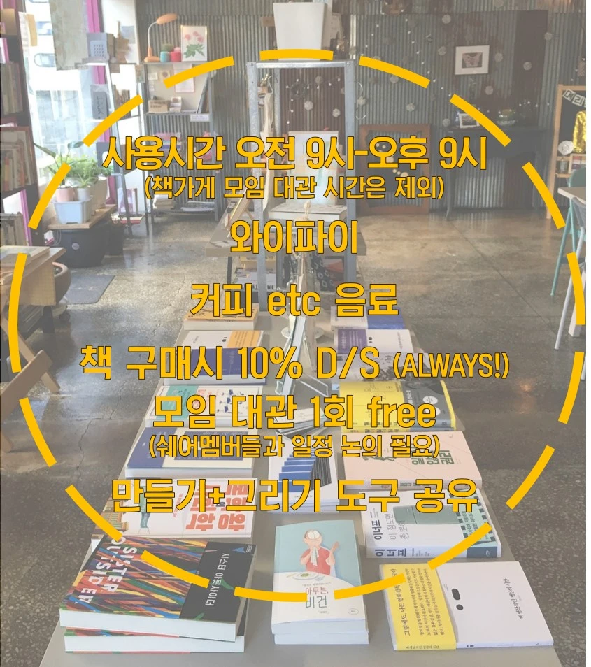 두둥! 책가게 운영시간에 큰 변동이 생겼다. 4월부터 평일 일을 하게 되었다. 나 역시도 예상치 못한 변동 사항이다. 급하게 결정한 것 같지만 사실 오랫동안 생각한 것 같기도 하고. 내가 평일에 일을 한다고 해도, 공간 운영은 계속 하고 싶다. 하지만 공간 이전까지 이 넓은 공간을 비워두기는 아깝다는 생각에 뭘 해볼 수 있을까 생각하다 공간 공유를 해보자 싶었다. 이전에 서울에서 아는 사람과는 공간을 함께 써봤는데 이곳에서 모르는 사람과 공간을 함께 책임지는 게 가능할까, 내가 괜한 일을 벌리는 것인가 등 이런저런 고민을 하다가 부딪혀봐야 알겠지 하는 나의 당연한 고민의 답을 또 확인하며 모집 공고를 정성스레 만들어 냈다.