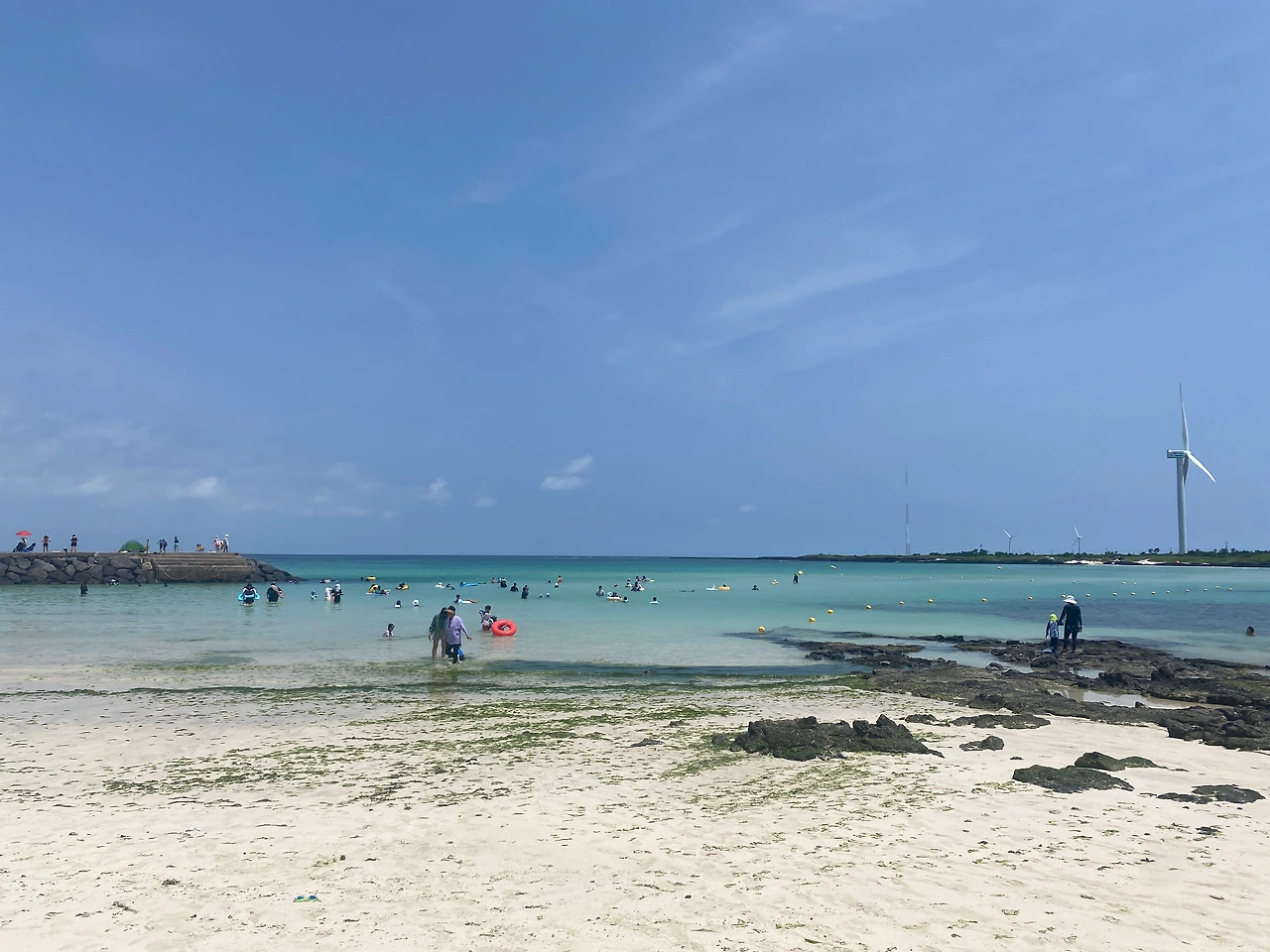 제주도 종주 마지막 날! 일출을 보러 월정리 해수욕장으로 나갔다. 수평선 위로 이글거리며 얼굴(!)을 내미는 태양께 무사히 마지막까지 달릴 수 있게 해 달라 빌었다. 해변에 개장을 준비하는 스태프들은 일찍부터 나와 일하고 있었고 그 틈에 파도소리 들으며 일출의 윤슬을 한없이 바라보았다. 다시 숙소로 돌아와 네 번째 완전 무장을 하고 빵집을 들러 맛난 빵과 커피를 먹고 김녕해수욕장으로 향했다. 마지막 날은 다른 날에 비해 달리는 거리가 짧아서 바다 수영을 여유 있게 오래 할 수 있을 것 같아 친구와 상의해서 김녕해수욕장으로 가기로 한 것이다. 김녕 해수욕장은 예전에 왔을 때 지나가기만 했었는데 여름 성수기에 스노클링의 성지일 줄은 몰랐다. 방파제 근처 무리 지어 스노클링 강습을 받으며 눈에 보이는 신기한 물고기에 사람들이 환호를 지르고 있었다. 나와 친구도 완전무장을 해제하고 수영복을 입고 그 풍경 속에 뛰어들었다. 맑은 바닷물 속 니모 친구들이 내 수경 앞을 지나갔다. 깊이도 적당히 얕은데 있고, 또 크게 팔을 저으며 수영하기 좋게 깊은 곳도 있고 물과 하늘은 맑고 무엇보다 열대어들까지! 어린 시절 가족여행 포함 내 평생 바다수영에서 가장 즐거웠던 시간을 가졌다. 인류애와 물고기애가 합쳐져서 자연과학에 경이로움을 가졌다고 하면 조금 넘치는 표현인 것 같기는 하지만, 원래 첫 경험의 환희에는 경이로움이 따라오는 게 자연스러운 거니까... ^^;