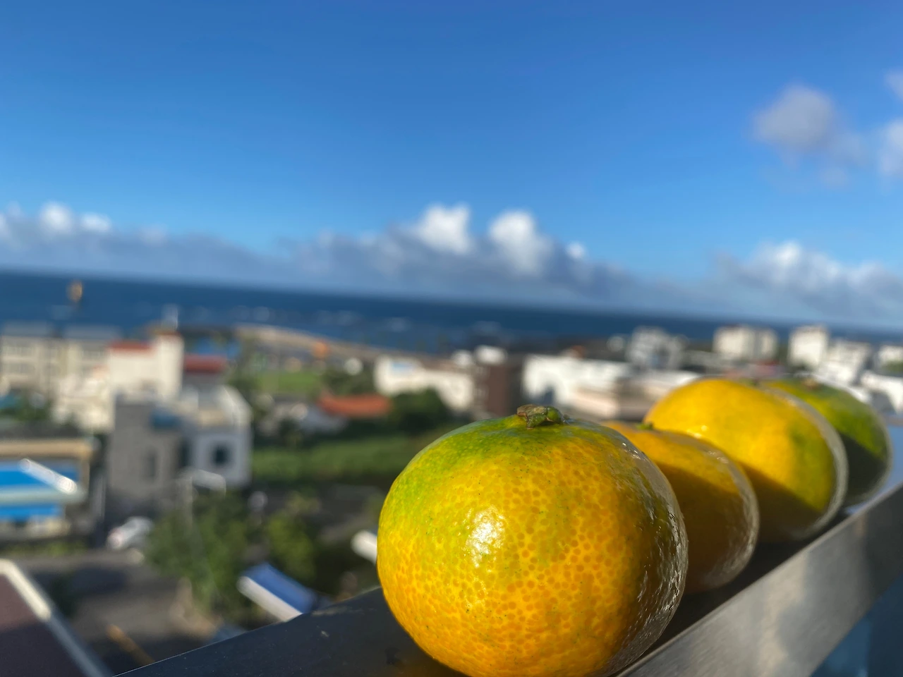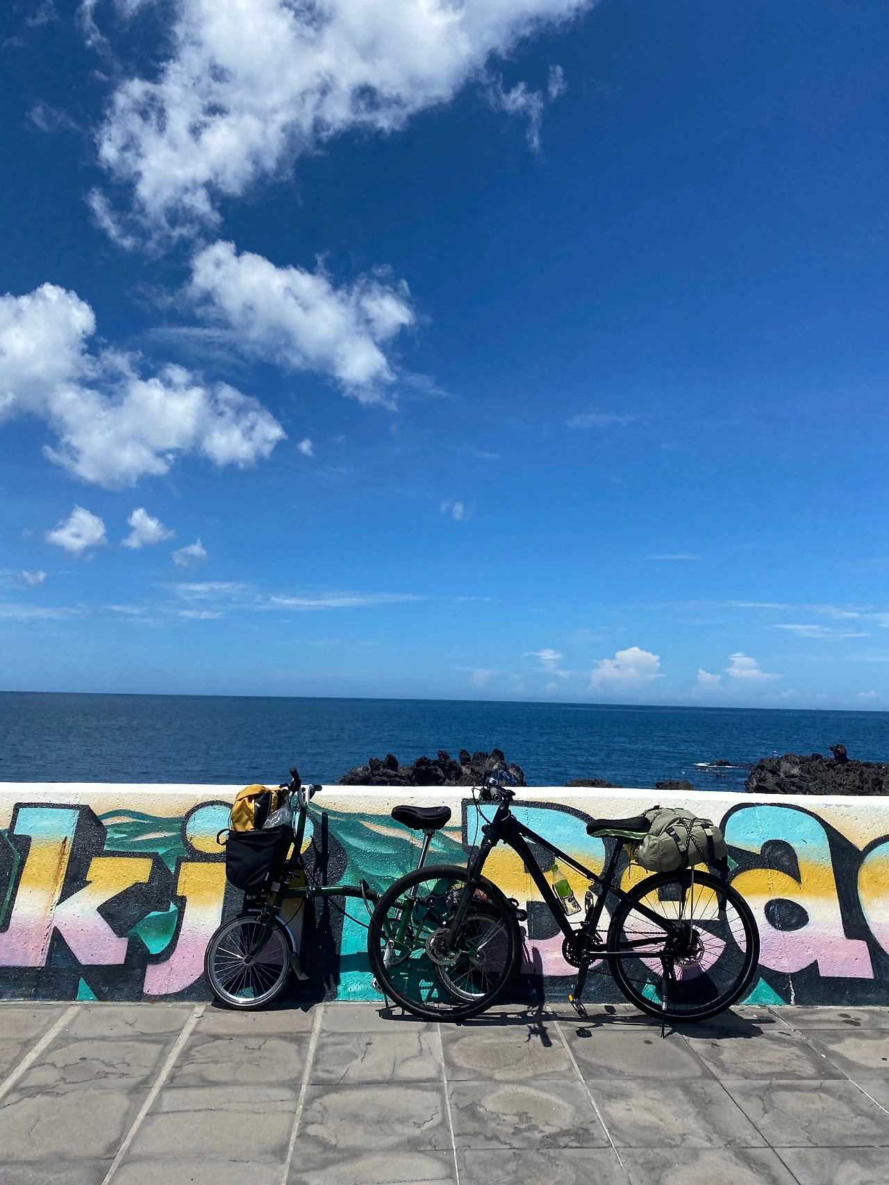 머리부터 발끝까지 해가 피부를 마주할 일 없게 중무장을 하고 짐 정리를 하고 자전거 바퀴 바람을 확인하고 자전거길을 확인했다. 자전거 렌탈샵은 제주시 시내에 있었고 그 기준 동쪽에서 서쪽으로 돌기로 했다. 첫째 날 숙소가 있는 모슬포항 근처까지 자전거로 61km. 오전 11시를 넘겨 4개의 페달이 움직이기 시작했다. 제주 환상 자전거 길이 드문드문 끊겨있기도, 상태가 안 좋은 구간도 있지만 그래도 여행자들이 많이 찾다 보니 나름 파란 라인 와 이정표는 찾기 쉬웠다. 그 길을 따라 제주 시내를 벗어나고 해변길로 접어들기까지는 오래 걸리지 않았다. 땡볕 아래에 자전거를 타니 땀이 엄청나게 났다. 비로소 종주를 하는구나를 실감할 수 있었다. 바다와 하늘의 풍경이 너무 멋져서 넋 놓고 페달을 밟았다. 첫 휴식에 장소인 편의점에 들러 챙겨간 텀블러에 든 물을 한숨에 다 마셔버렸다. 그리고 바로 산 음료도 한 숨에 다 마시고. 경기도에 살다가 얼마 전 제주로 와서 편의점을 오픈한 지 얼마 안 되었다는 편의점 사장님은 이 날씨에 종주를 하는 우리를 신기하게 보시며 응원해주셨다. 종주 기간 종종 음식점에서도, 귤가게에서, 숙소에서 만난 분들이 응원해주셨는데 참 감사했다 *^^*