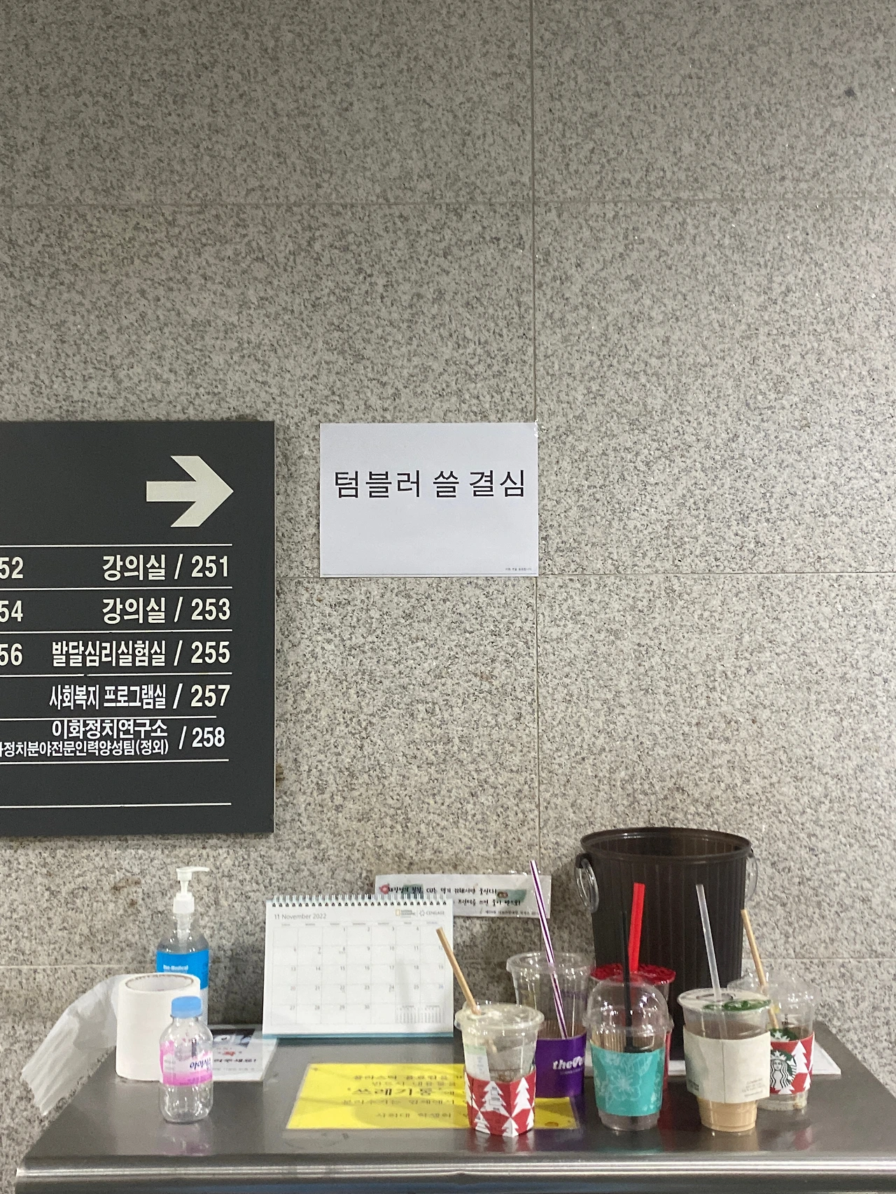 어느 날 보틀팩토리 인스타그램 계정에서 연남동-연희동 일대 1회 용품 플라스틱 줍기를 할 거라며 멤버를 모집하는 글을 보았다. 환경부에서 1회용품 보증금제 전면 시행을 적응 기간을 이유로 당분간 보류하겠다는 뉴스에 반대하며 벌이는 일종의 환경운동이었다. 마침 시간이 될 것 같아 동참했다. 팀을 나눠 플라스틱 쓰레기를 줍는 김에 다른 종류의 쓰레기도 주웠다. 텀블러 사용이 예전보다 늘어도 일회용품 쓰레기는 어느 곳에나 있었고 그놈의 담배꽁초는 세트로 흩뿌려져 있었다. 아마 매일 정해진 시간 환경미환원들이 치워도 이렇게 쓰레기가 나오는 걸테다. 길에 쓰레기가 있어야 미화원이라는 직업이 할 일이 있다는 쓰레기 같은 경제 논리도 생각나는 풍경을 마주하며 보람찼지만 마음은 무거웠던 시간을 보냈다. 쓰레기를 가득 채워 궁동산을 넘어와 잠시 쉬었던 공간, 카페 샘에서 마신 시금치바나나 주스가 참 맛있었다.