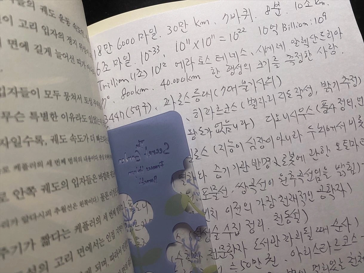이 책이 본가에도 있었는데, 구정 때 아빠한테 읽어보았냐 물었는데 몇 년 전에 두 번이나 읽었다고 꽤 자랑스럽게 얘기하셨다. 책 속에 꽂혀있는 아빠의 필기체로 책의 내용이 메모된 종이를 보니 왜 때문인지 코 끝이 찡해졌다. 20대 초부터 38년을 섬유화학 공장에서 일한 뒤 잠시 쉬었다가 지금은 고층 주상복합 건물의 경비일을 하는 나의 아버지. 쉬는 날 도서관에서 책을 빌려 읽고 세계 여행 다큐 채널을 보며 티비 속 여행으로 여가를 보내는 나의 아버지. 자신이 꾸린 가족의 생계를 책임지는 역할에 충실한 생을 여전히 보내고 계신다. 나의 아버지도 책 코스모스의 저자 칼 세이건처럼 밤하늘의 떠 있는 별들을 보며 우주를 궁금해하고 과학사를 스스로 공부하셨다는 것이 대단하다는 생각과 짠하다는 측은한 마음이 동시에 들었다. 재수 끝에 취업을 선택하지 않고 대학을 갔다면 아빠의 인생이 지금과 달라졌을까? 그랬다면 나는 태어나지 않았겠지만... 아빠의 과거를 볼 수 있는 시간 여행도 조만간 가능하지 않을까 싶다. 책 코스모스를 같이 읽은 동지로써 아빠에게 빚을 진 기분이다.