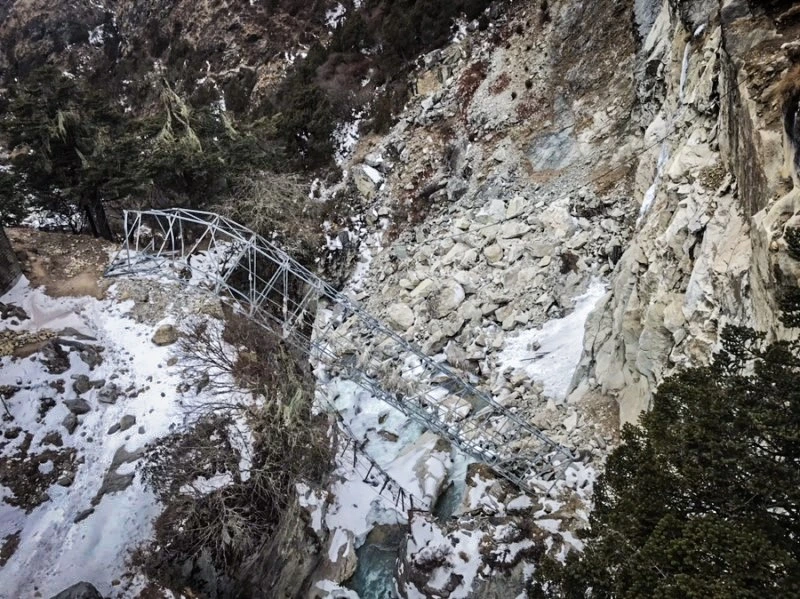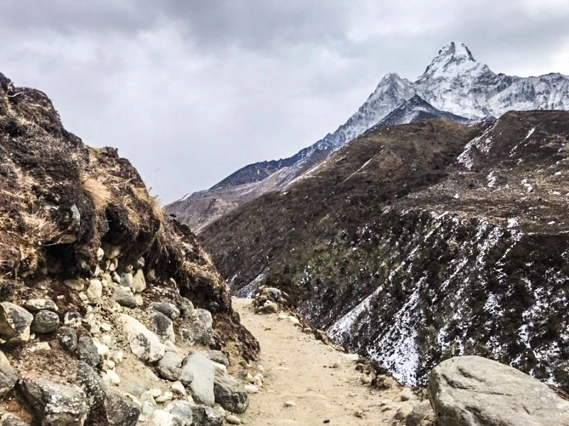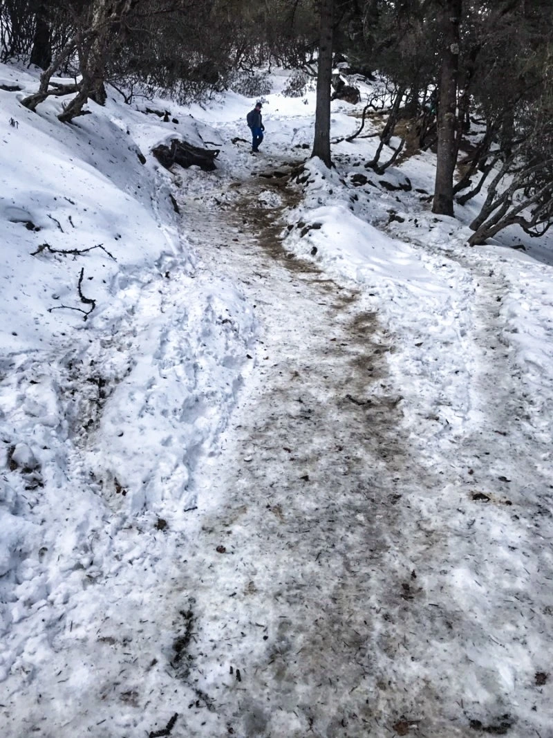 지난밤 머물렀던 ‘텡보체’라는 마을에서 30분간 내려가면 ‘데보체’라는 마을이 있는데, 녹지 않은 눈길과 빙판 때문에 아이젠을 끼워야 했다.